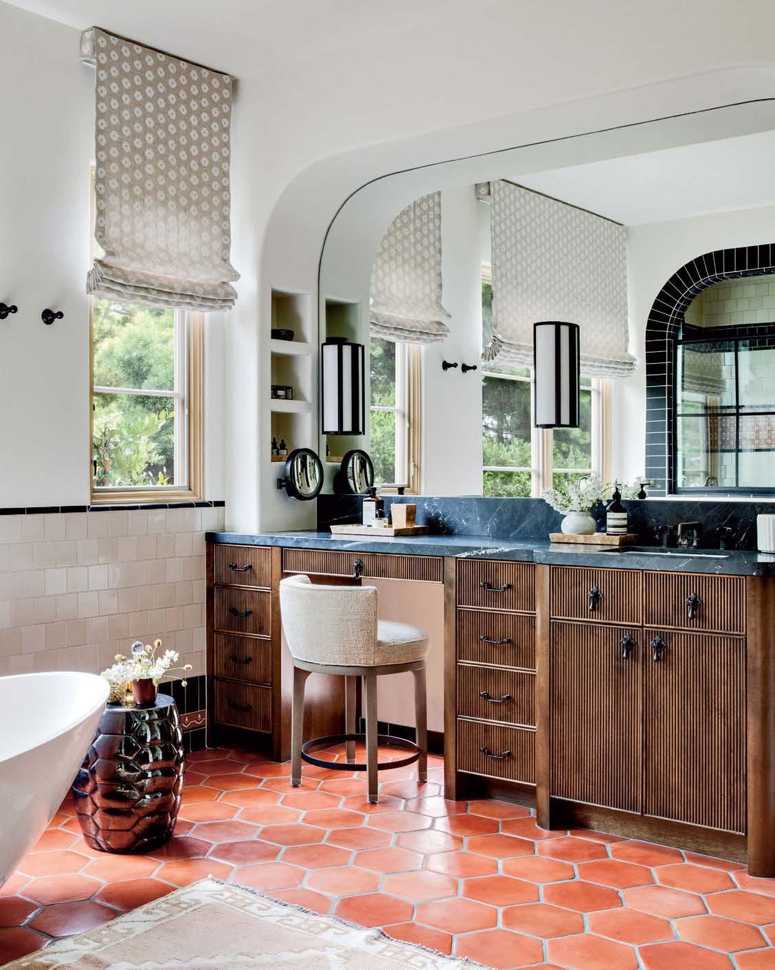 Right: By scaling back the size of a dual shower with Phylrich fixtures into a still-generous space, the primary bathroom gained intimacy and character. Mission Tile West-clad walls harmonize with Saltillo tile floors.