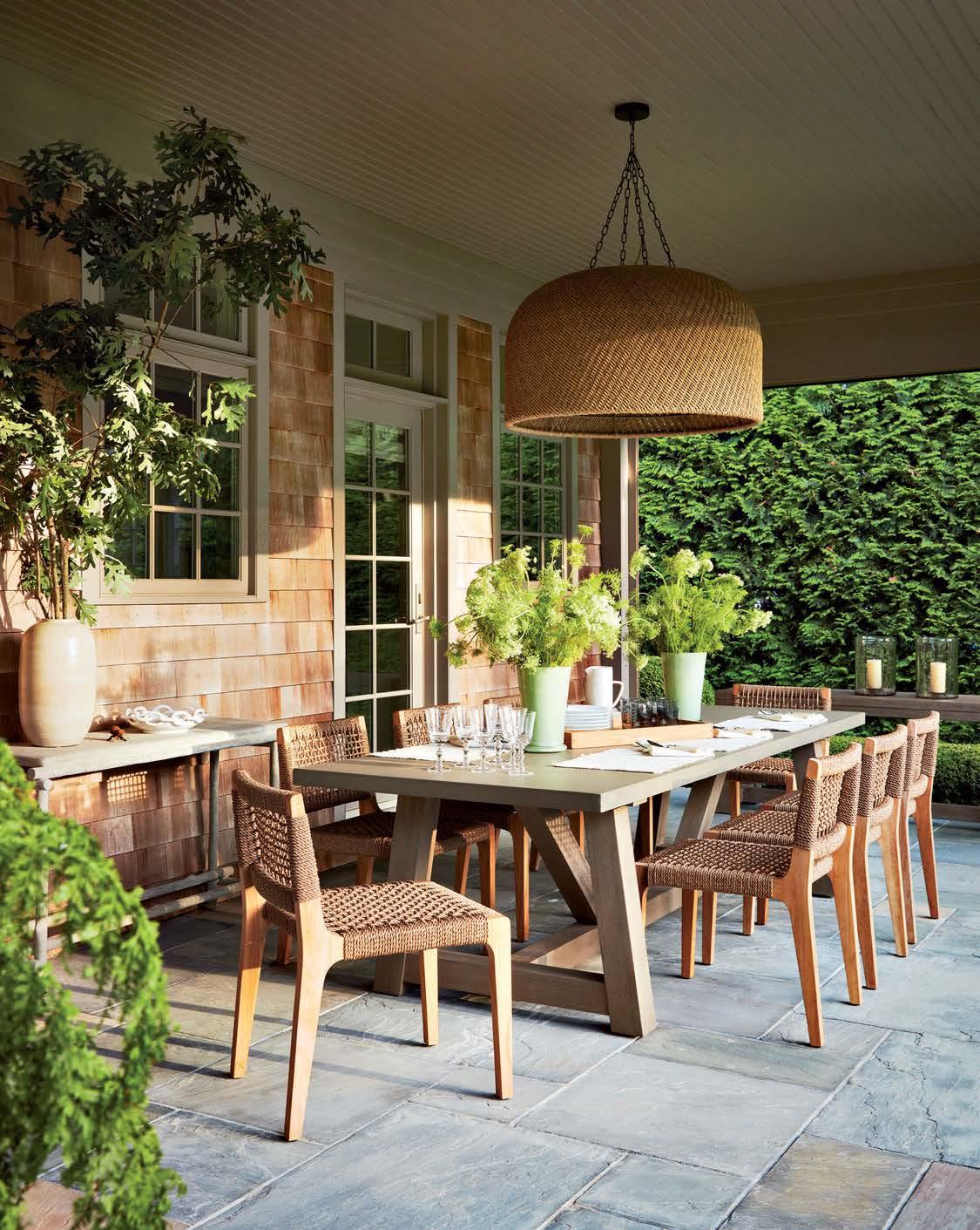 Opposite: Dinner parties alfresco abound on summer evenings. The RH teak-and-concrete table surrounded by Harbour Outdoor chairs makes for a relaxed atmosphere while a Palecek pendant provides illumination for meals that go late into the night.
