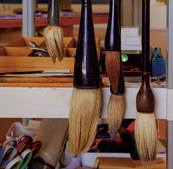 Paintings decorate the walls of artist Ellen Little’s studio, including Backyard No. 405, Nocturnes 27 Backyard No. 434 and Backyard No. 454 (opposite, from left). During walks, the artist collects dead insects, flowers and leaves (left) to inspire her work. She uses goat-hair calligraphy brushes (below) as well as traditional watercolor brushes. A detail of Goat Hill 32 (bottom, left) showcases regional flora.