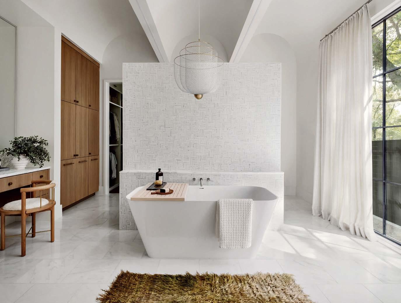 Above: In the main bathroom, Signature Hardware’s tub with Newport Brass fixtures, all from Ferguson Bath, Kitchen & Lighting Gallery, is surrounded by Ann Sacks tile. Moooi’s chandelier complements Mokum draperies from Holly Hunt.