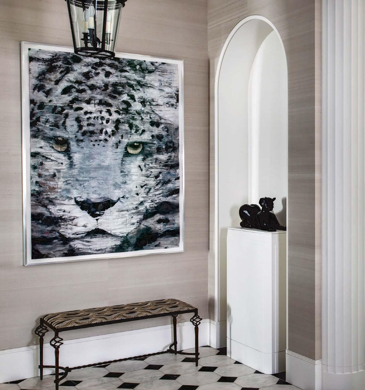 A Gabriel Vormstein piece welcomes guests in the foyer. Custom columns flank the entry to the living room, where a Lorna Simpson painting hangs over the mantel, and Masson daybeds by Dmitriy & Co sit opposite a coffee table from Cosulich Interiors & Antiques.