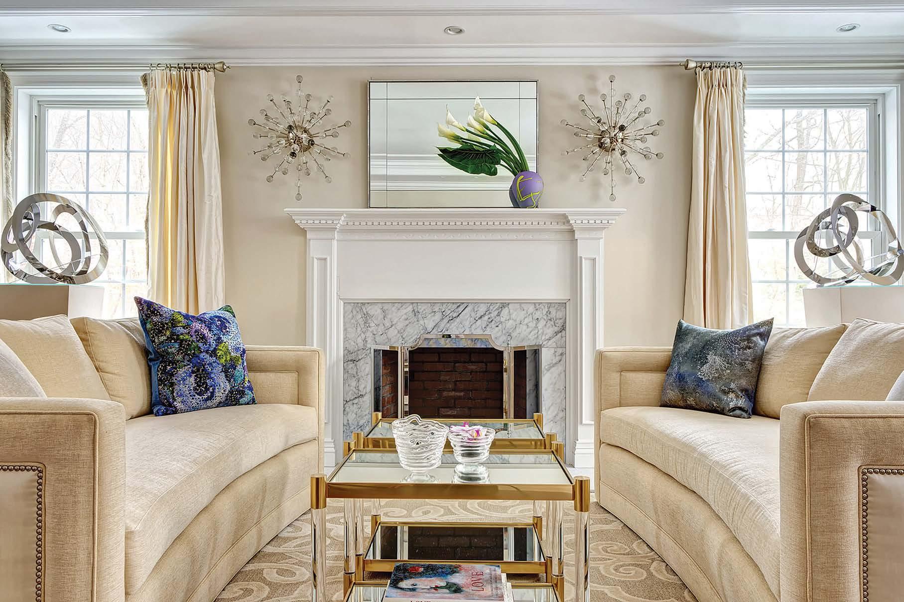 At one end of the living room are two Ferrell Mittman sofas covered in Rosemary Hallgarten fabric and a coffee table from Swaim. Above the fireplace are Vaughan sconces and a mirror from Ironies.