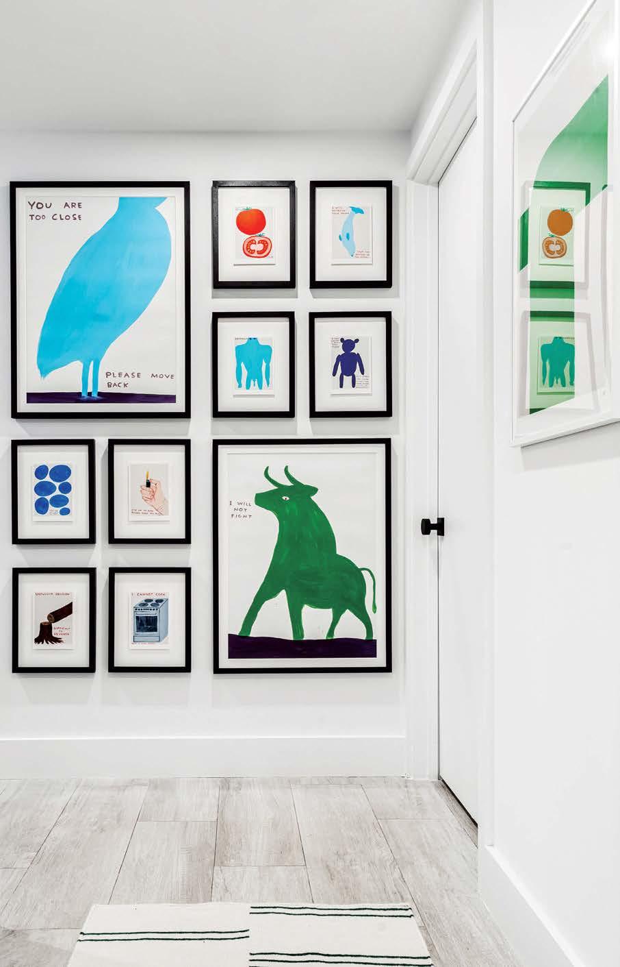 Left: A gallery wall of 10 David Shrigley works sets the tone in the foyer. Nordic Knots’ Stripes rug and Emtek’s Berlin door handle contribute to the graphic feel.