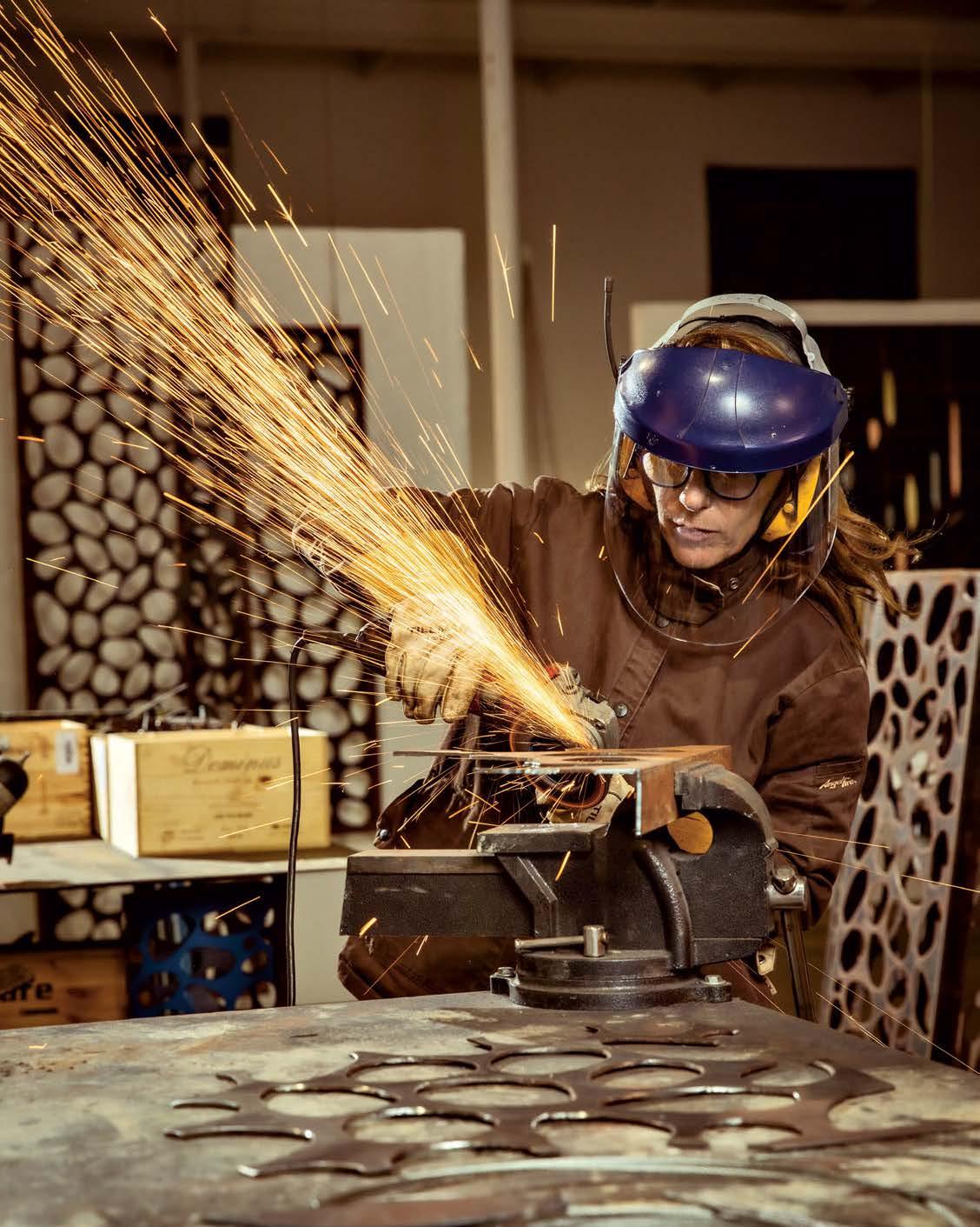 The Little Haiti studio of artist Carolina Sardi (opposite and bottom) displays her steel wall pieces, freestanding sculptures and architectural applications. Each composition, which is typically painted or plated in chrome or copper, plays with organic forms and balances positive and negative elements through cutouts (left and below). Her creation process involves drawing, performing geometric equations and grinding, welding and carving steel.