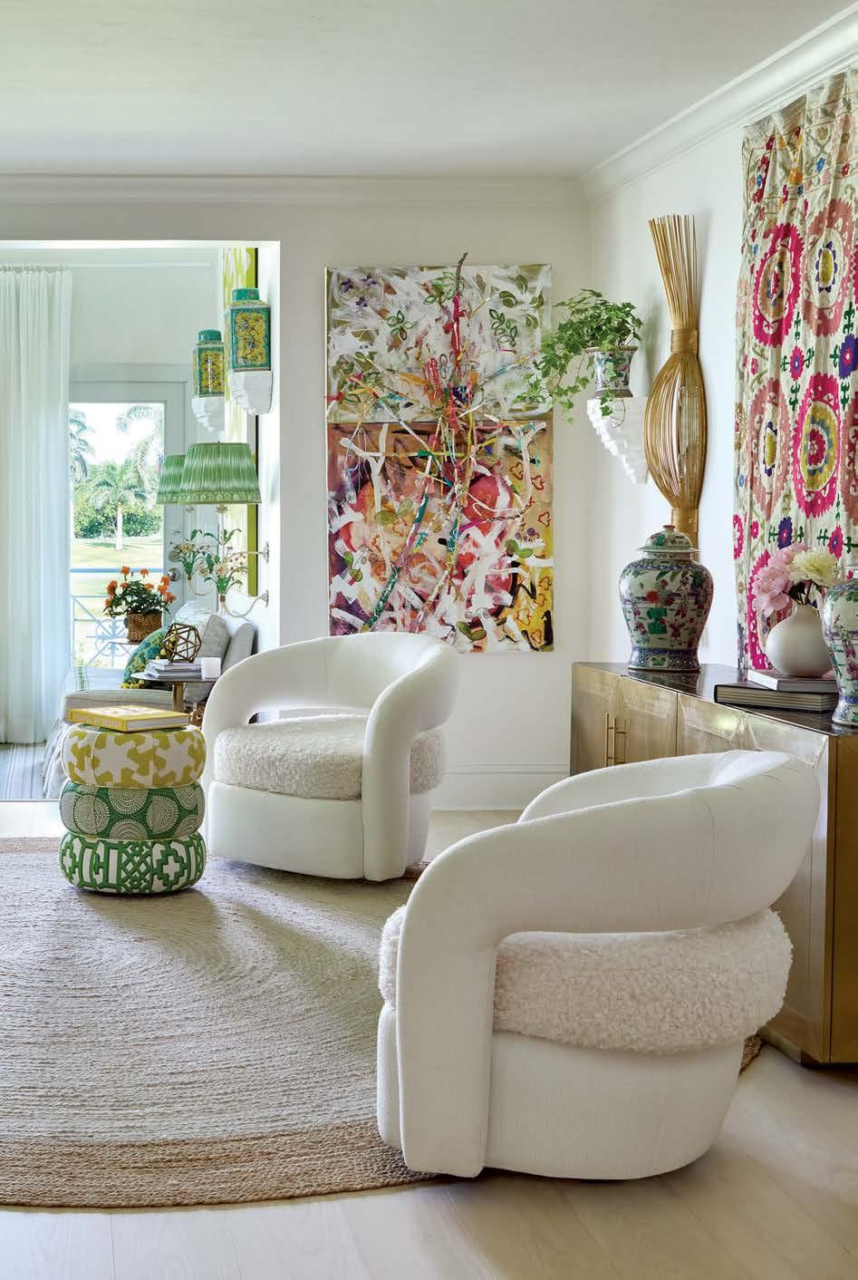 Take the living room, where a pair of Stephanie Henderson bull’s-eye paintings inspired the rounded backs of both sets of lounge chairs as well as their placement atop the sphere jute underfoot. “Ironically, the 1970s saw the birth of the circular rug,” the designer observes. In a move she describes as “landscaping the room,” she carried the theme through to the finishing touches, deploying curvaceous ginger jars across tables, floors and other surfaces.