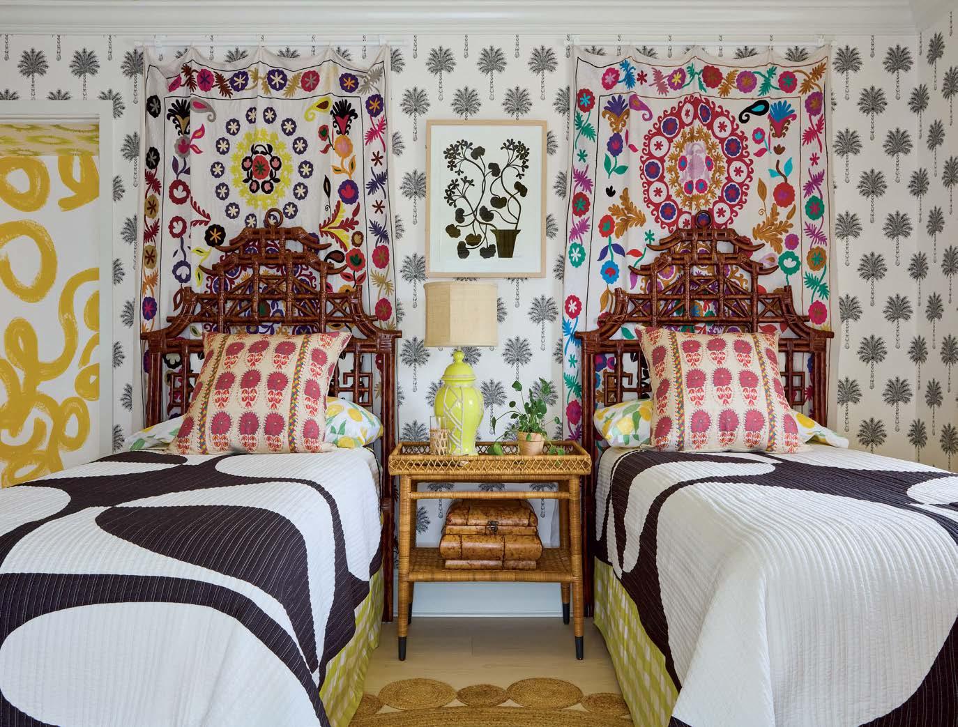 Above: The black-and-white scheme of Pierre Frey’s Les Palmiers wallpaper tempers the sweetness of the guest bedroom. Furbish Studio Suzani textiles accompany the Kenian beds. A Denise Fiedler collage from Quirk Gallery is displayed above the Made Goods nightstand and vintage lamp.
