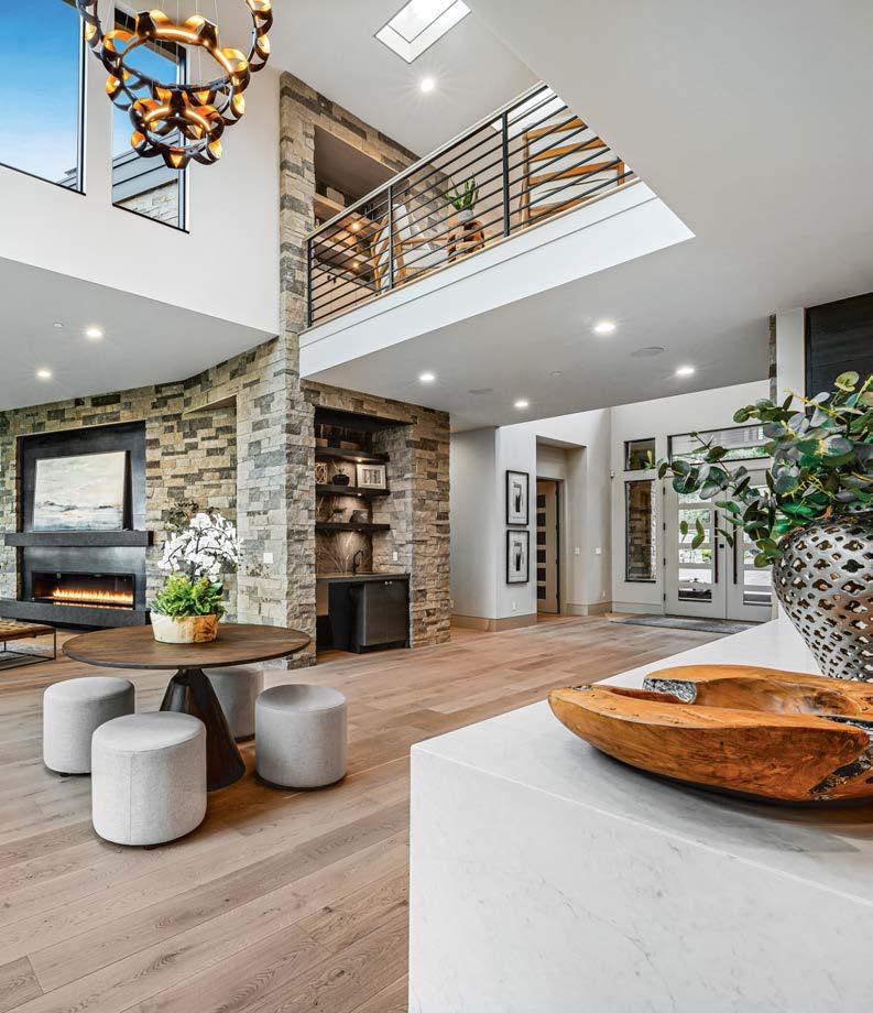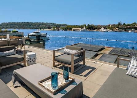 Top Expansive outdoor living areas are perfect for soaking in the sweeping, 150-degree views of Lake Washington. Bottom A soaring great room is the heart of the home and creates a deep connection to the scintillating water.