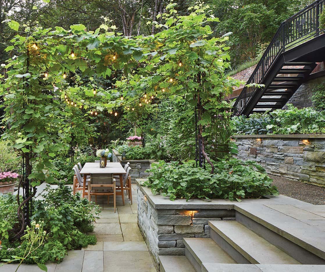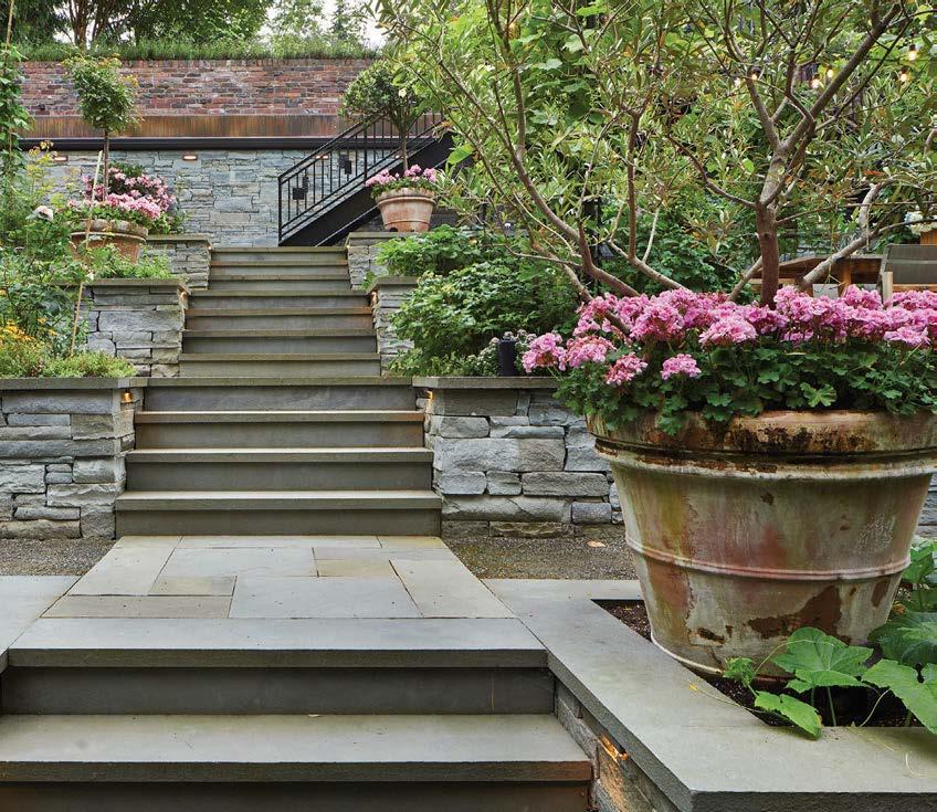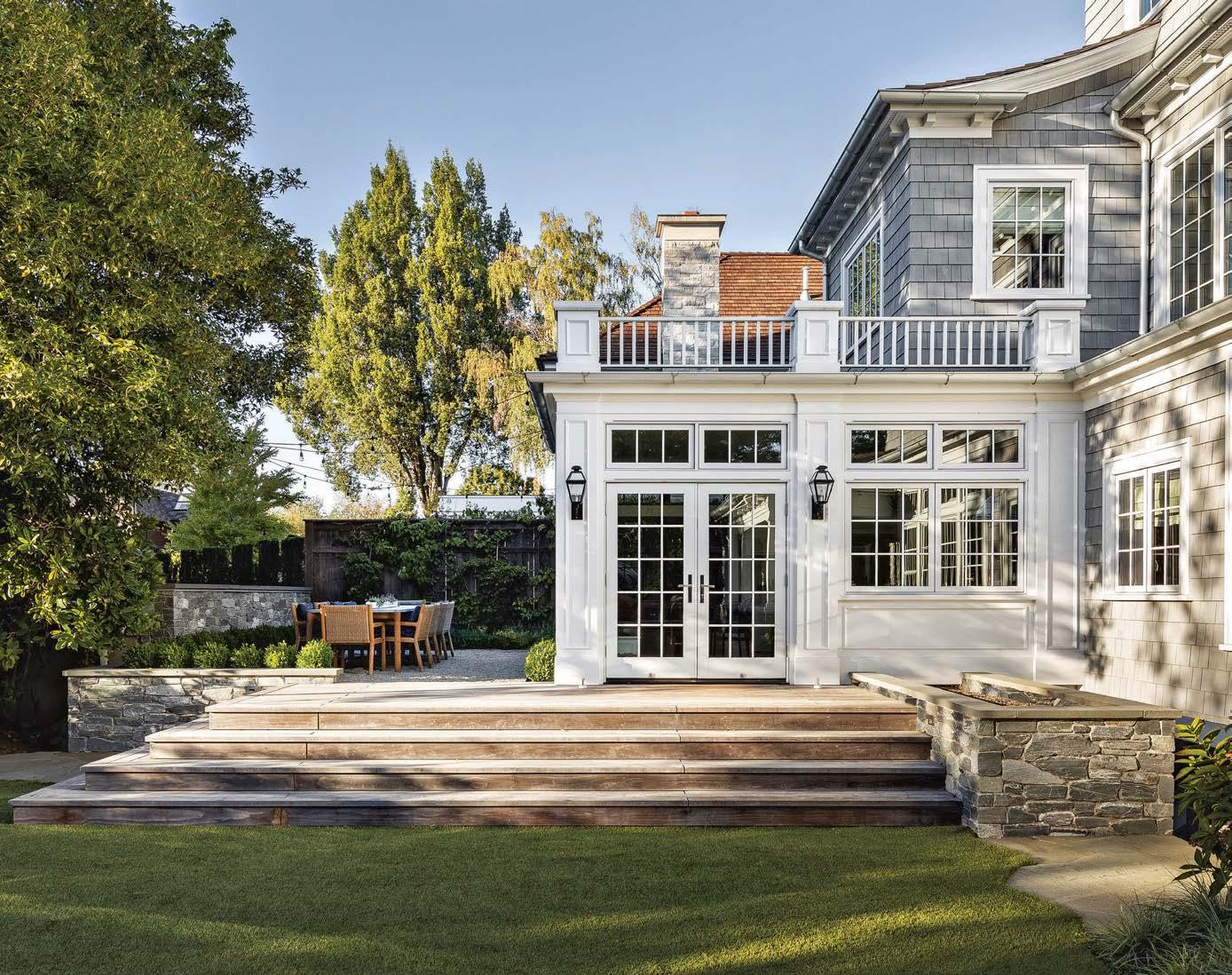 Top An aerial shot of the rear façade highlights the floor-to-ceiling windows that allow those inside to take full advantage of the property’s views. Bottom The Reed Estate has a gorgeous geometric garden alongside the patio and the rear of the home.