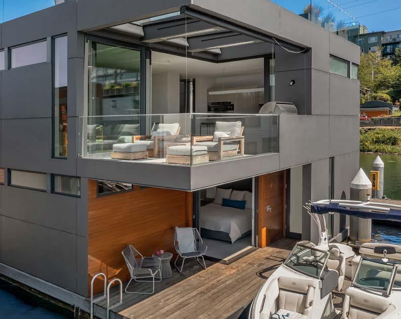 This modern floating home in Wards Cove in Seattle’s Eastlake neighborhood was built with the utmost detail. Finishes include Pedini cabinets, sandstone floors and Miele appliances. The primary suite includes a wall of glass that opens onto a heated waterside deck. The enormous roof patio features panoramic views of downtown, Lake Union, Gas Works Park and more. This exceptional property offers easy access to downtown and the Eastside.