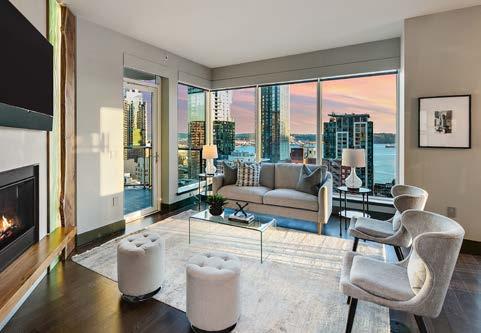 Top View easements protect the stunning vistas of Elliott Bay and the Olympics from this sophisticated southwest corner residence at Fifteen Twenty-One. Bottom Besides the world-class views, Fifteen Twenty-One offers exceptional amenities including a 24-hour concierge, gym, yoga studio, rooftop terraces and private meeting room that are the ultimate in luxury living.