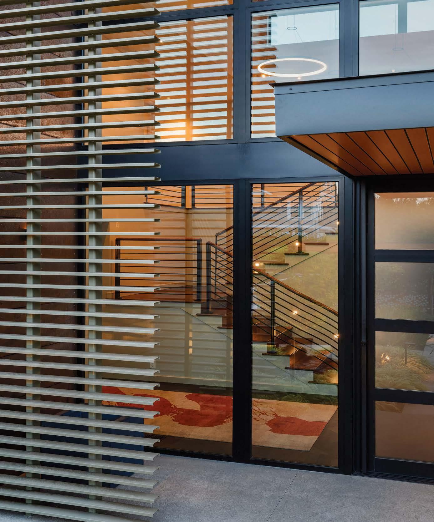 Top Beautiful Eagle Harbor is known for its stunning views of the marina, ferries and picturesque Seattle skyline. Left Magnificent design details—including this hand-forged copper fireplace—wow in this home.