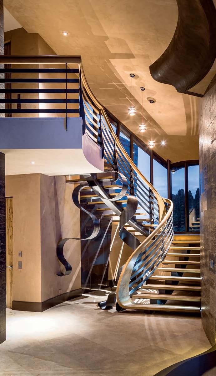 Above: The design team worked with Michael Northrop of Metalworks & Design LLC to create the Art Nouveau-inspired stair railing crafted from blackened steel. The walls are cloaked in Benjamin Moore’s Classic Gray, the same hue found in the kitchen.