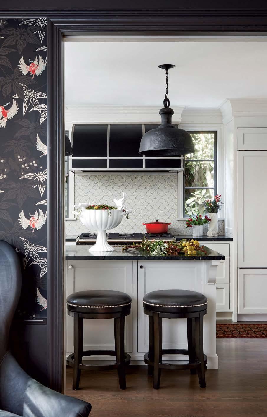 Right: The kitchen cabinets, fabricated by Warmington & North and painted Benjamin Moore’s Classic Gray, coordinate with the Pratt + Larson tile backsplash. A bespoke hood pairs with Currey & Company’s Timpano pendant.