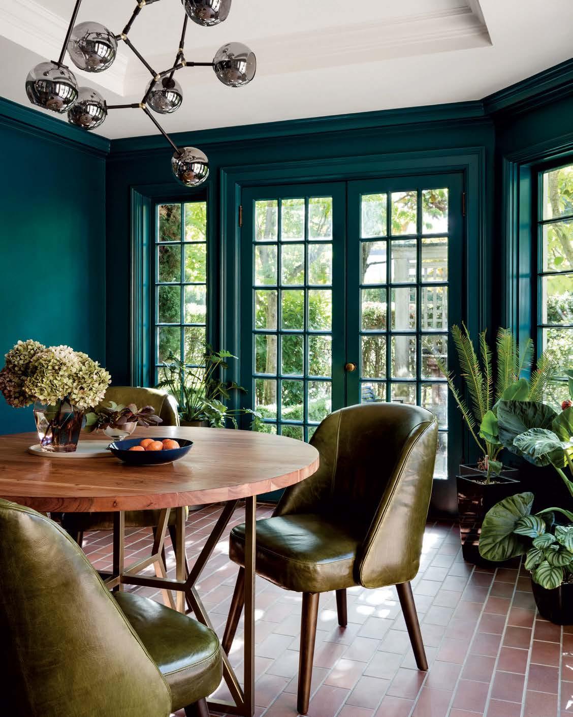 Opposite: Benjamin Moore’s Galápagos Turquoise coats the sunny breakfast room. An acaciaand-brass Crate & Barrel dining table and Nuevo smoked-glass light fixture complete the space.