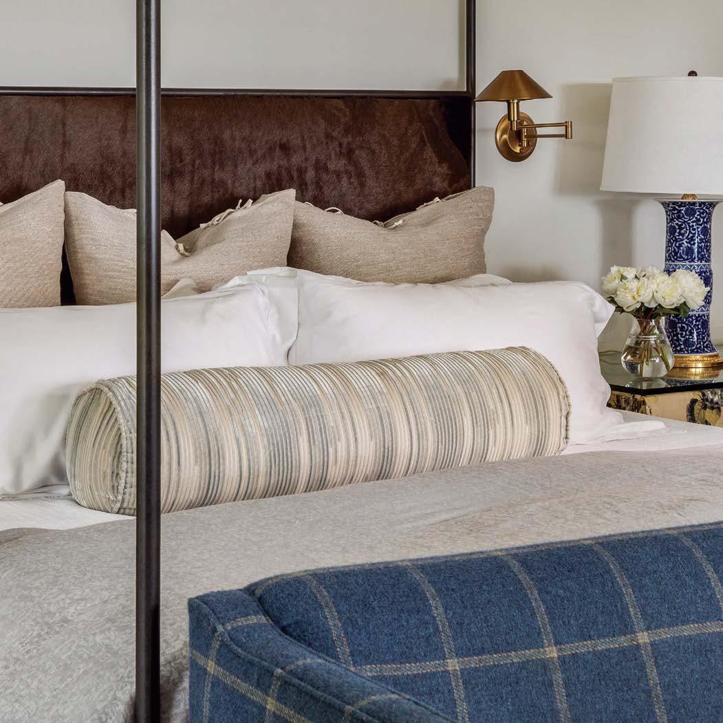 “By lightening the color of most of the walls, we’ve opened up the house, and the rooms appear visually bigger,” the designer continues. The one exception is the library. “The wood was still in good shape, so we left it all and just plastered the ceiling. It’s the reverse of the rest of the house, and I like that contrast,” Grevstad says. “The clients can go in and settle in front of the fireplace, watch television or work at the desk. There’s a little game table, too. It’s multipurpose, like the living room, but more intimate.” As is the primary bedroom, where the designer shifted to a richer, neutral palette that seems to magnify the greenery outside the windows.