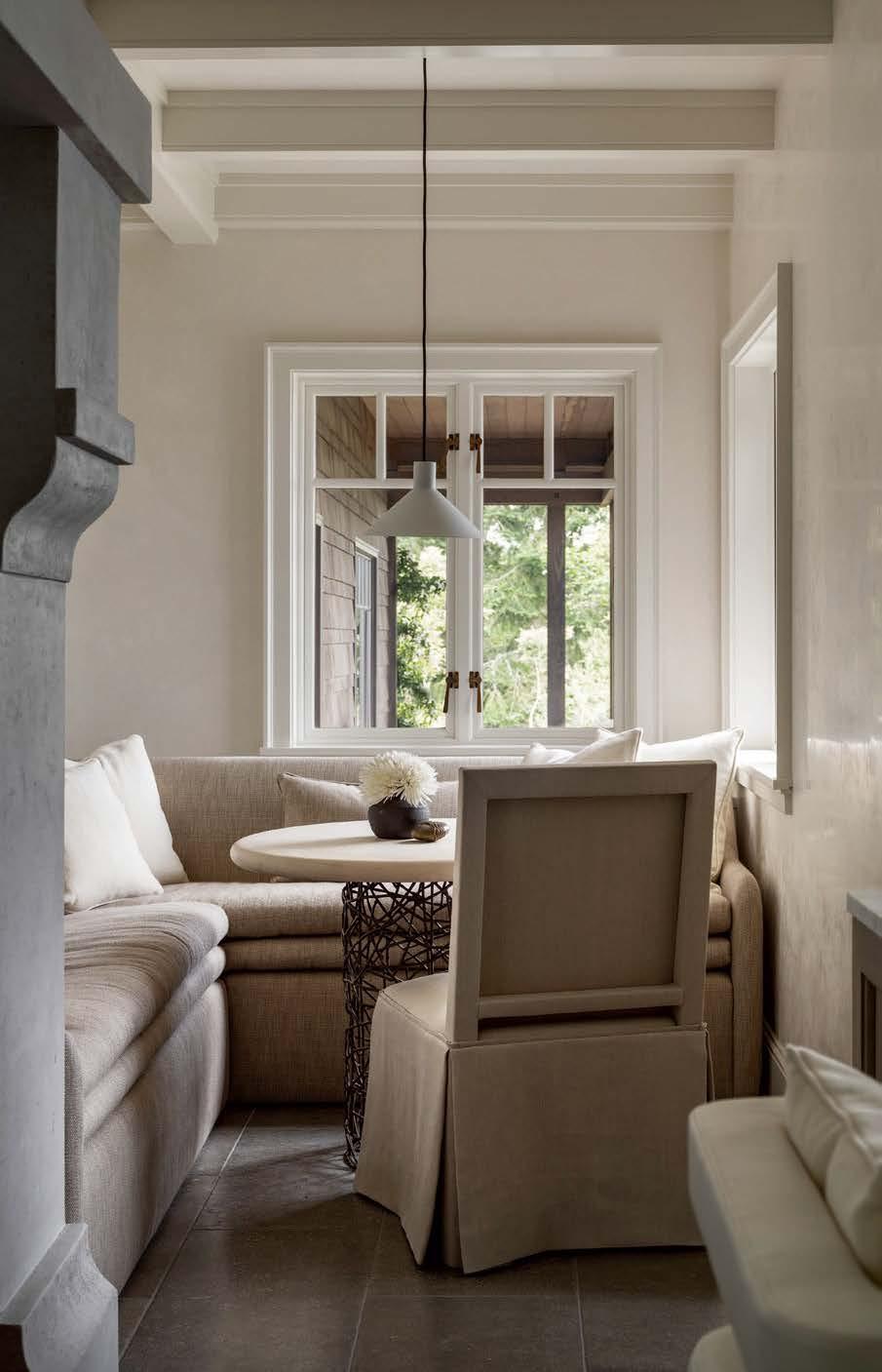 Right: A breakfast nook occupies one corner of the kitchen. The banquette and Formations chair wear a Perennials textile and Liaigre linen, respectively. The Formations table is illuminated by a Jonathan Browning pendant.
