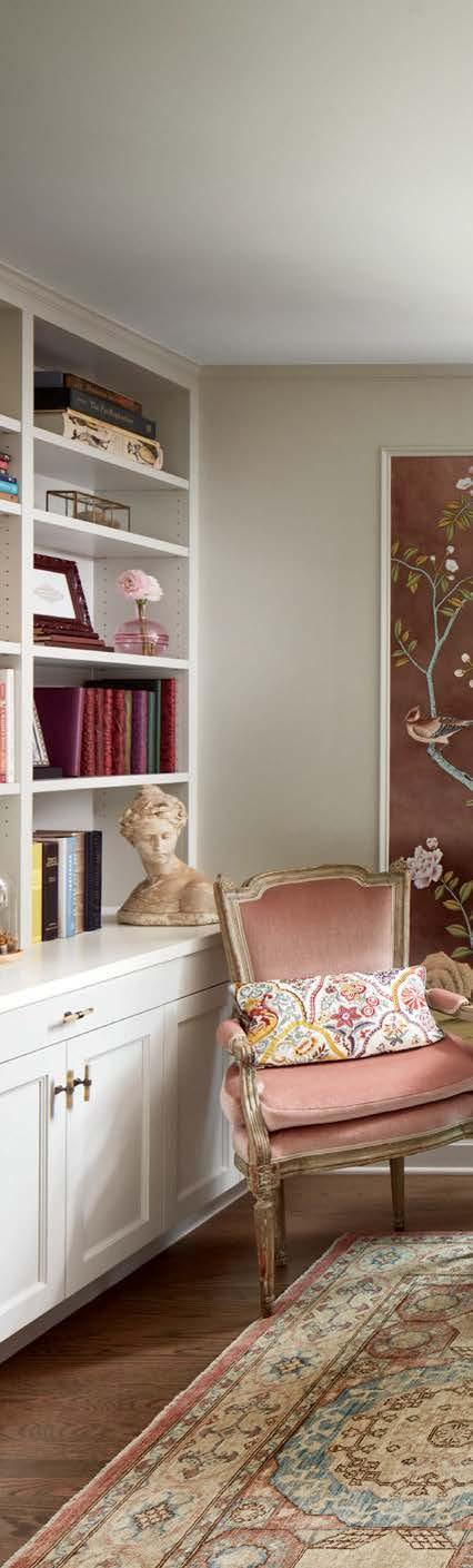 Balancing different decades of style, Adamson took inspiration from earlier designers like JeanMichel Frank, whose heyday was sparked during the Roaring ’20s. “During his career, he was layering in newer elements and exploring how to make them work together with historic features,” the designer notes. Adamson first focused on rejuvenating the home’s signature detailing, retaining much of the original hardwood flooring. Where replacements were required, “we took cues from the existing wood, incorporating the same dark tonality where possible,” she explains. To flesh out any gaps in the molding, Martine’s team specially milled new bases and crowns to match the existing trim.