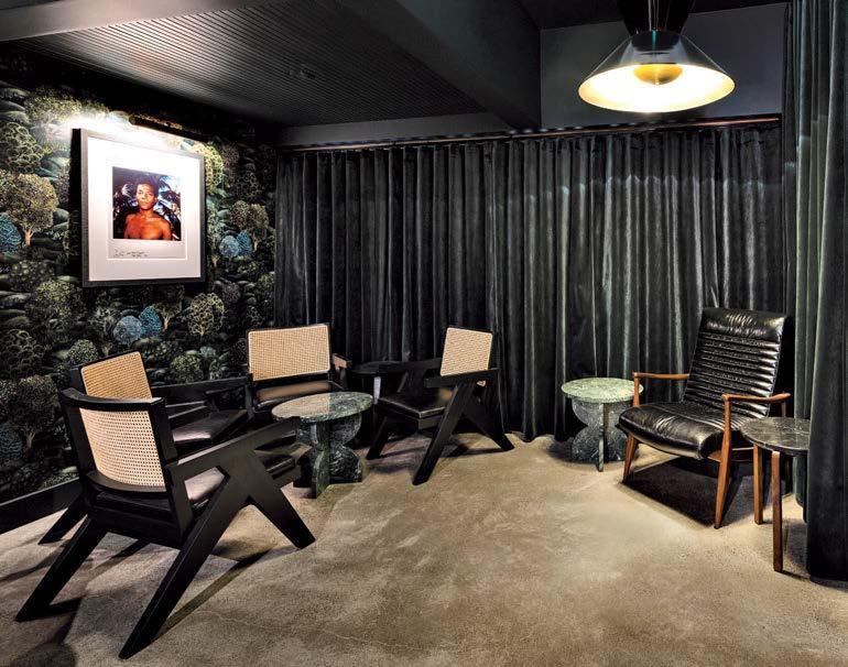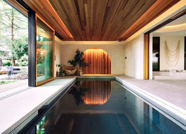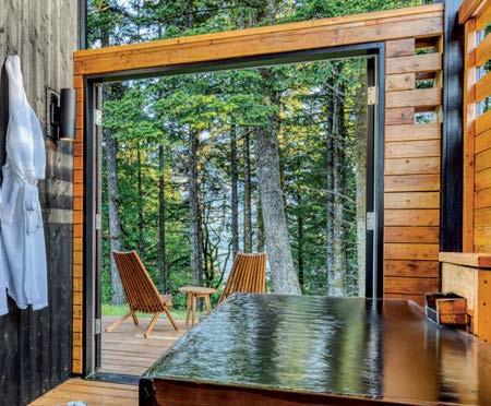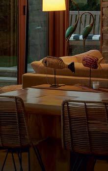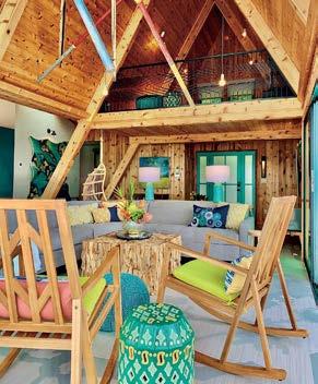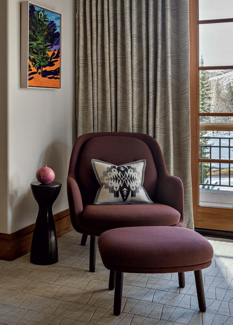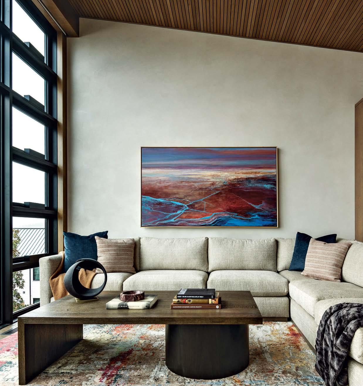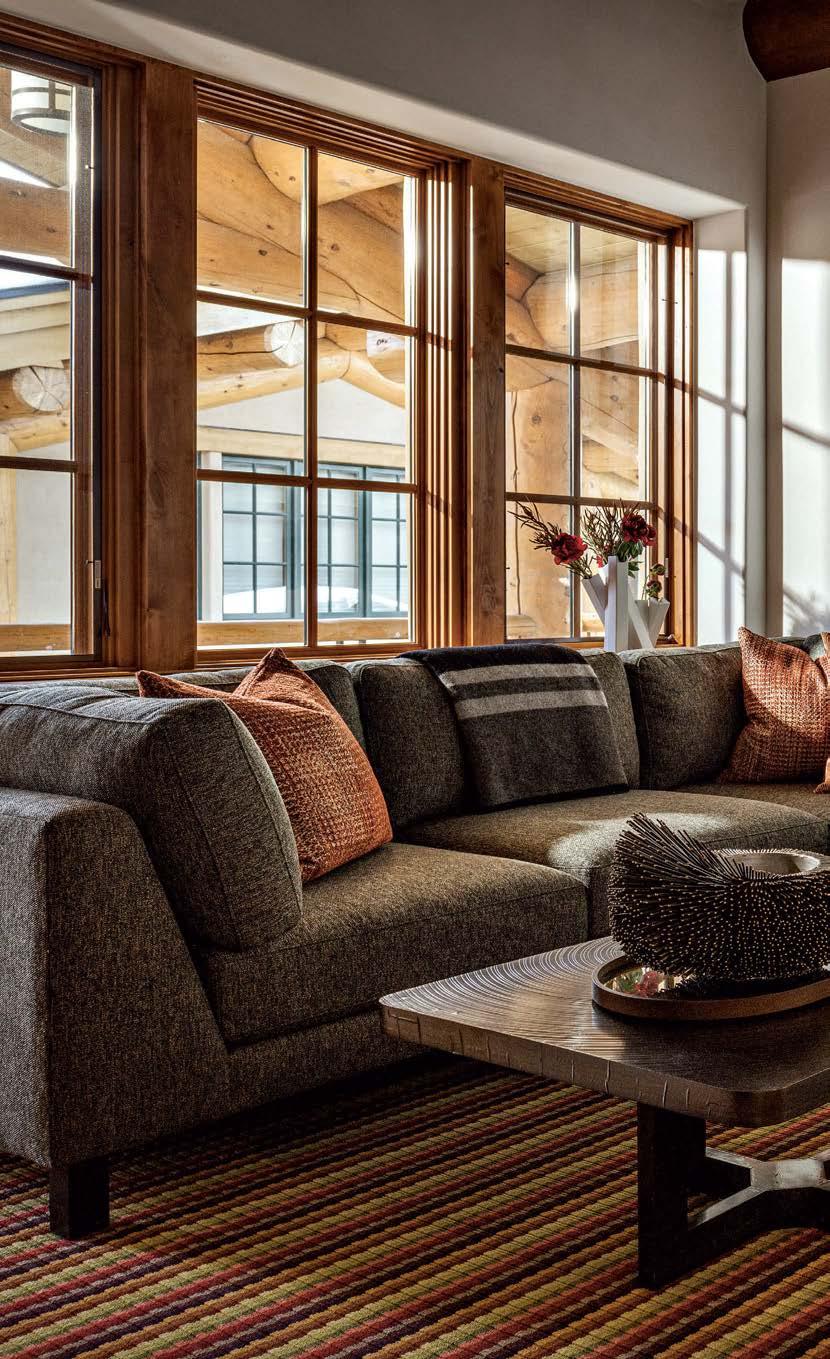 That’s how they found themselves the new owners of this condo, a retreat that is “the antithesis of our house in California,” Dale describes. The cabininspired interiors feature knotty log ceiling beams, a vast stone fireplace and breathtaking alpine views. “It represents the mountains to us,” she adds. “We wanted to maintain that integrity, while making it more comfortable for our family.”