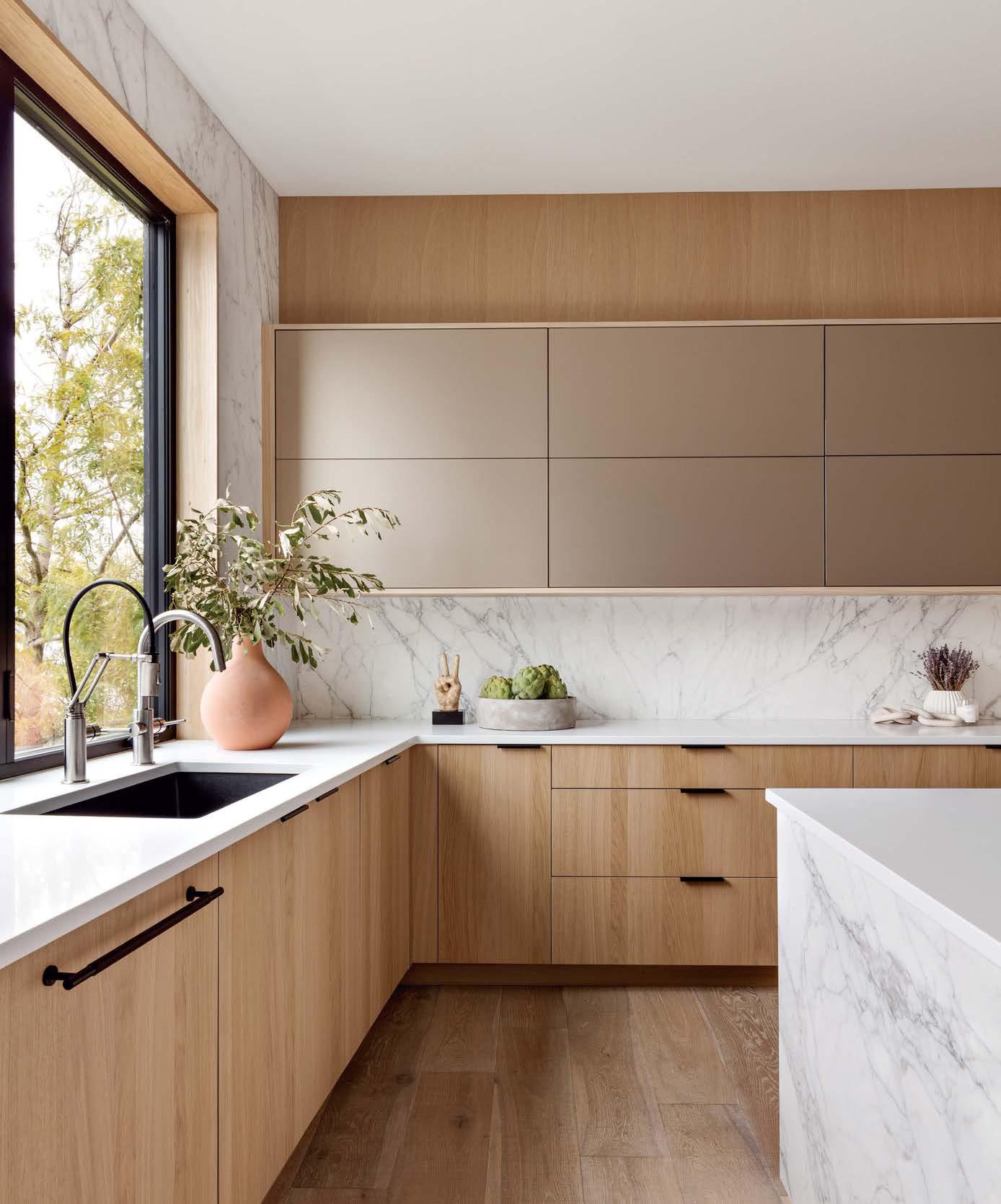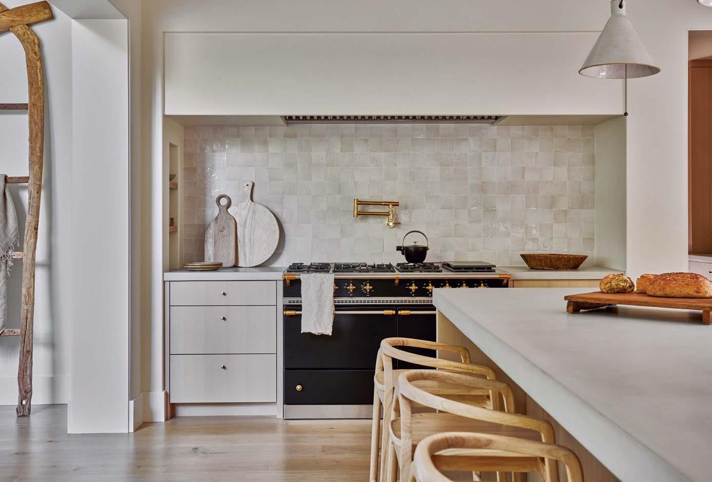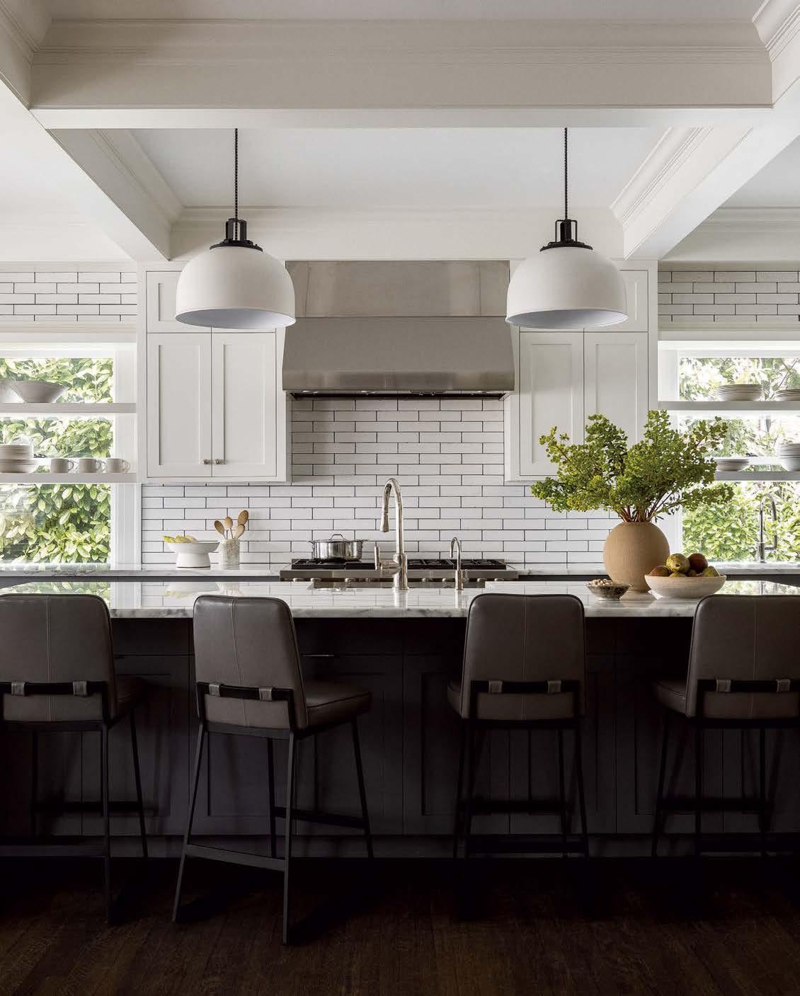 Opposite: At the kitchen island, topped with stone from Meta Marble & Granite, are barstools by Lawson-Fenning and pendants by Rejuvenation. The wall tile is from Statements Tile & Stone, and the range hood is by Wolf.