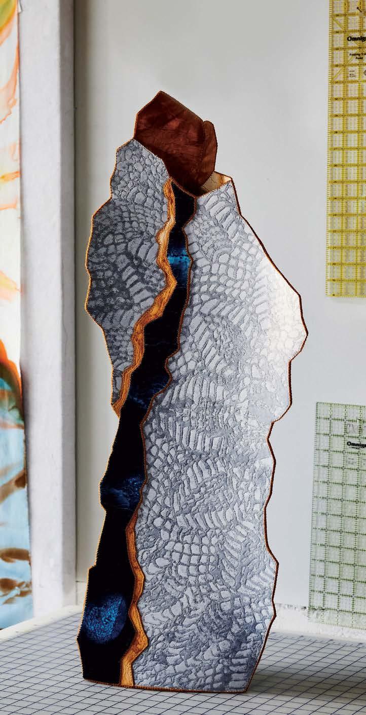 Seen in her latest body of work exhibited at Foster/White Gallery, Mason pushed the bounds of her mediums, crafting colorful stand-alone pieces that resemble geological formations and precious stones. The crisp, crystalline shapes come to life by backing her dyed fabrics with interface, a stiffening product typically used in quilting. “Often people don’t know what my work is,” she says with a laugh. “They’ll come into the gallery and ask, ‘Is it ceramic? Glass? Leather?’ The last thing they suspect is fabric.”
