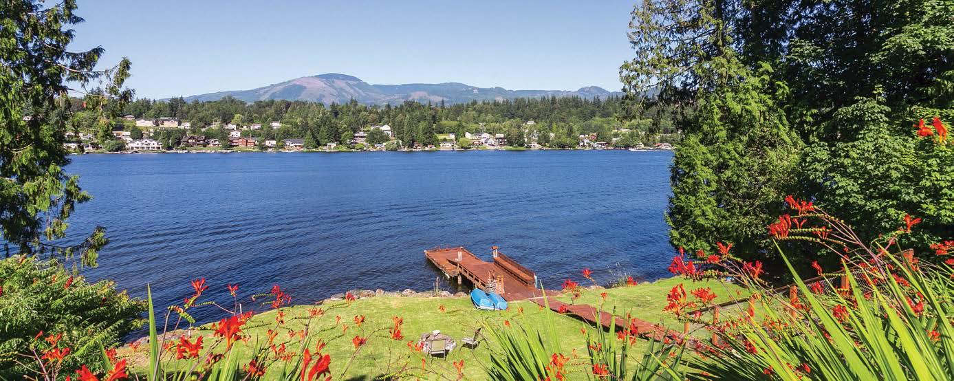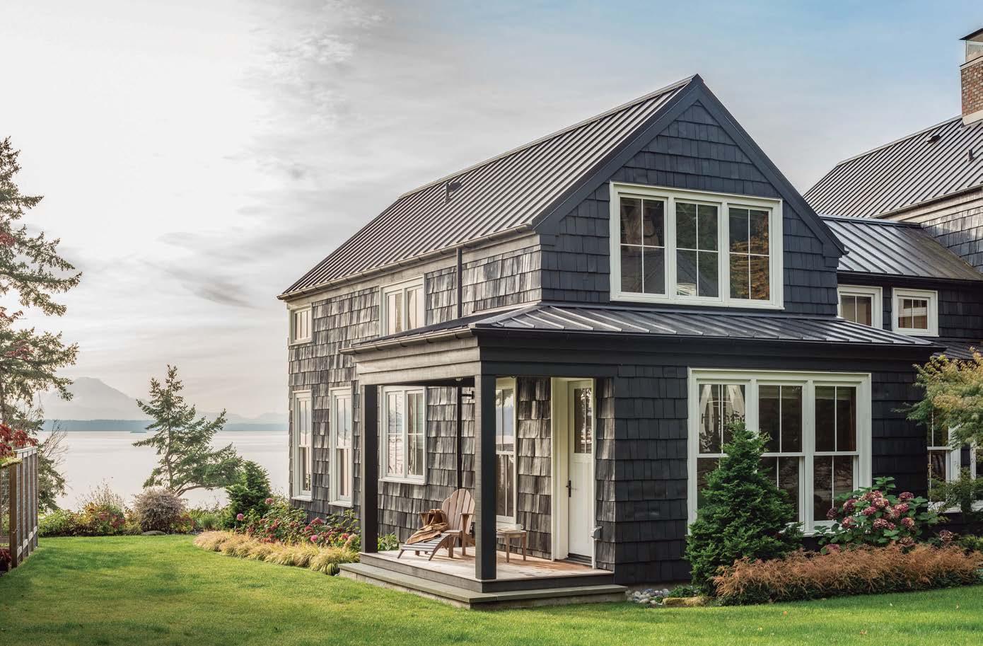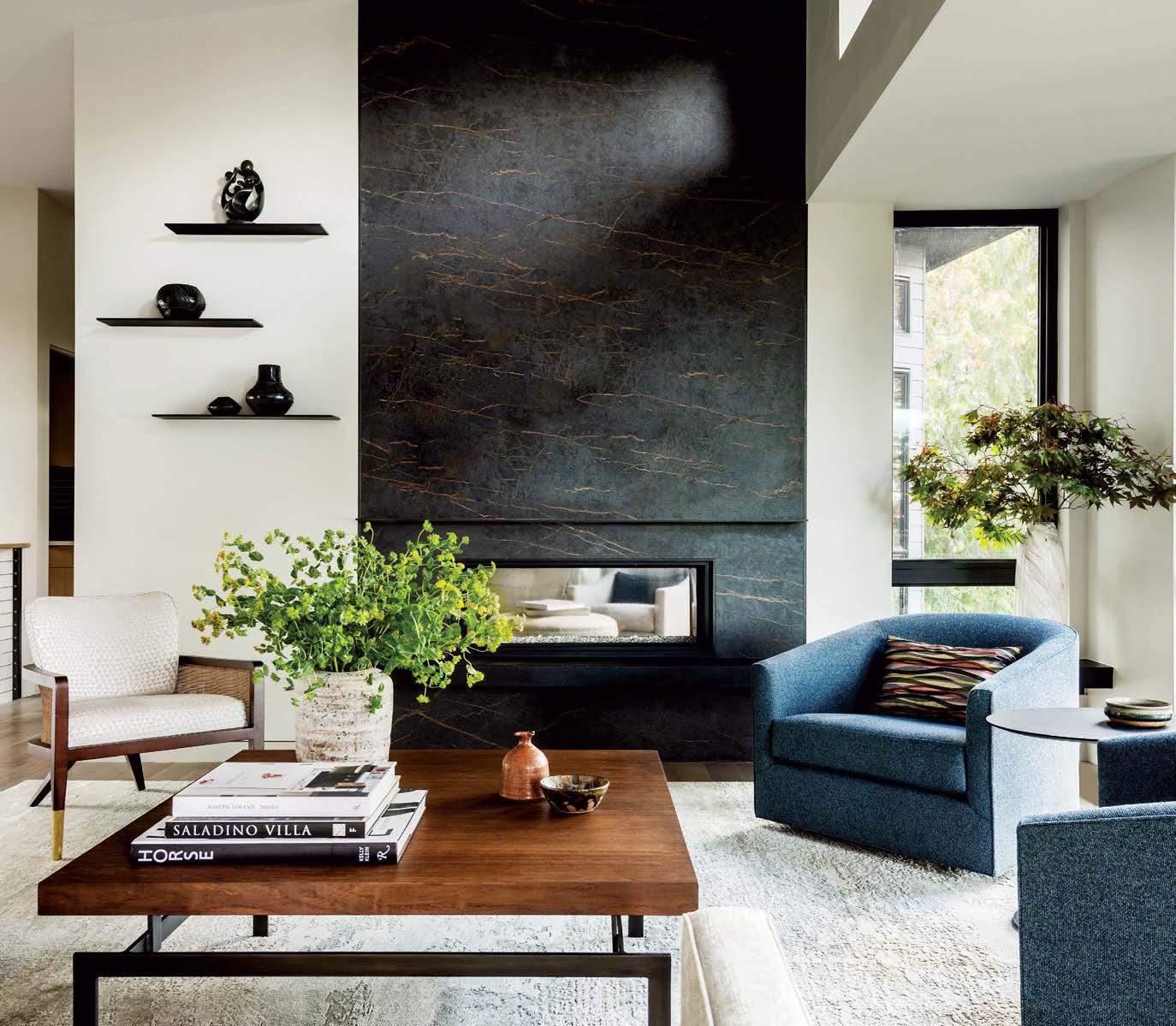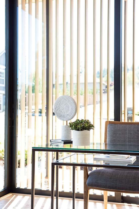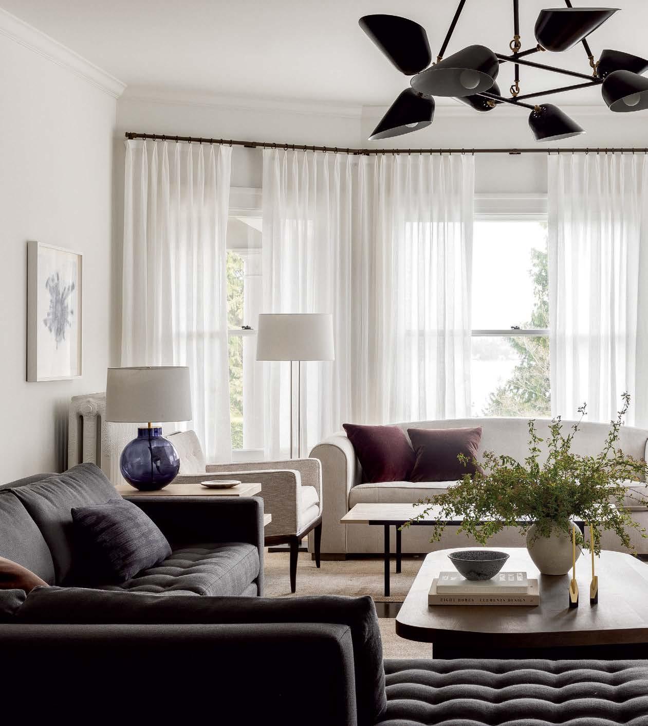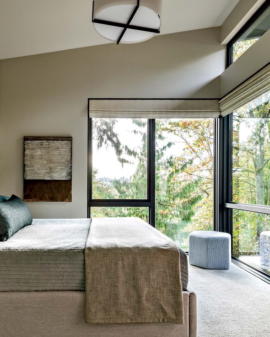 neutrals and added pops of color to create a sense of levity and youthfulness,” interior designer Kylee Shintaffer says. Rather than choosing an expected Northwest palette of earth tones, the designer used a crisp one of blues, grays and greens punctuated with warmer hues in surprising places, such as the blown-glass globes of the dining room’s chandelier or the living room’s orchid-hued ottomans and purple table lamp.