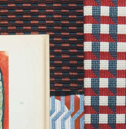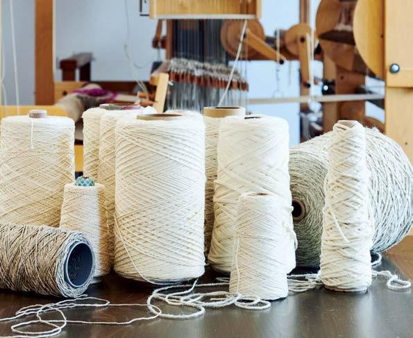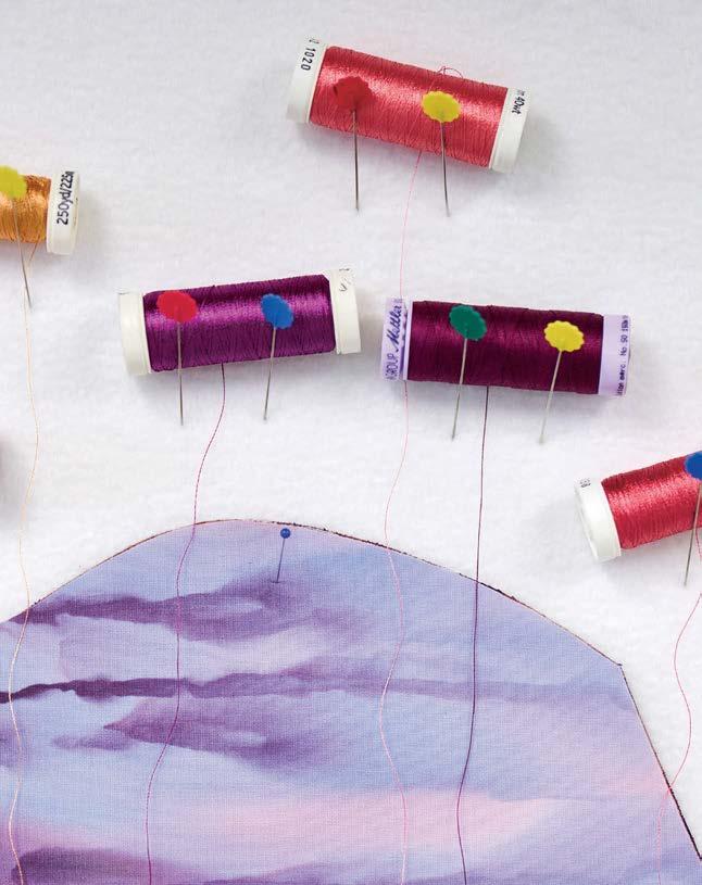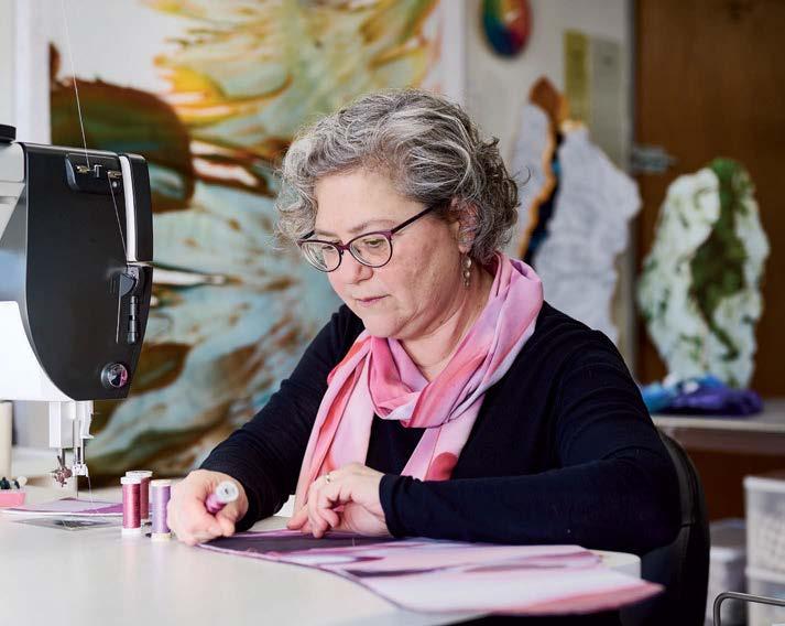 One of Cameron Anne Mason’s artworks, Townsend appears in her Seattle studio (opposite). The artist stitches hand-dyed fabrics together with colorful thread and interface to create her textured sculptures (left and below). Using exacting techniques, she produces a rainbow of textiles as raw material (bottom).