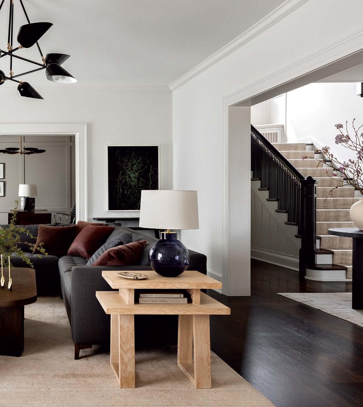 In this classic Seattle home’s foyer, designer Kylee Shintaffer conceived the center table, which sits beside a Crate & Barrel ottoman and below a pendant by The Urban Electric Co. The rug and stair runner are from Turabi Rug Gallery.
