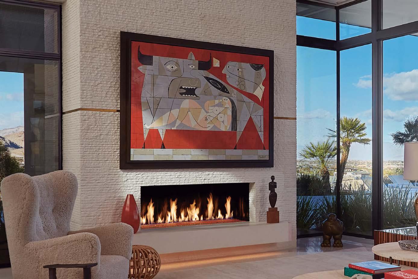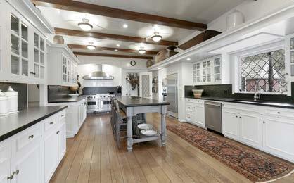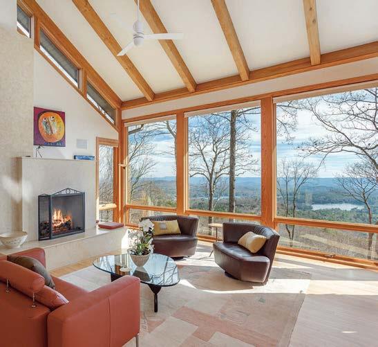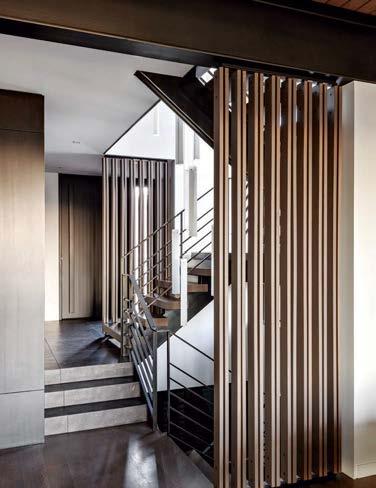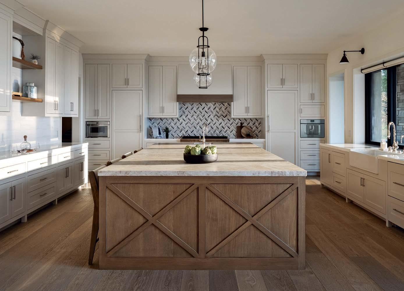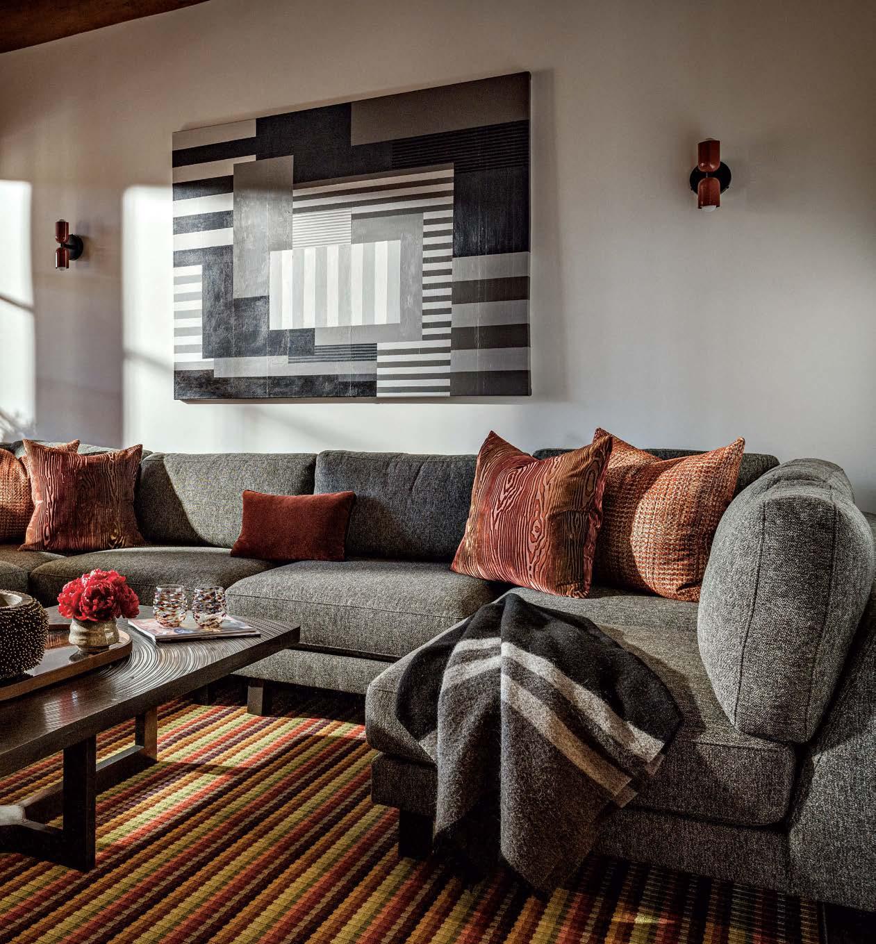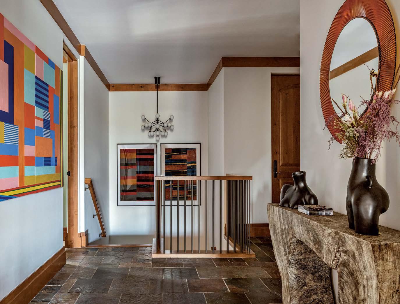 Along with general contractor Adam Elias, the design partners focused on judicious edits accentuating the home’s mountain milieu. The log beams and stone fireplace remained untouched, but the original floors were refinished to revive their luster. The team then uninstalled cumbersome window shutters, which allows light and mountain vistas into the home. They also removed excessive millwork, especially the wallto-wall built-ins lining the den and the L-shaped bar crowding the kitchen. These changes made room for a better furniture plan. “Noah and I always start by laying out the furnishings and how we want the space to flow,” Weiss explains.