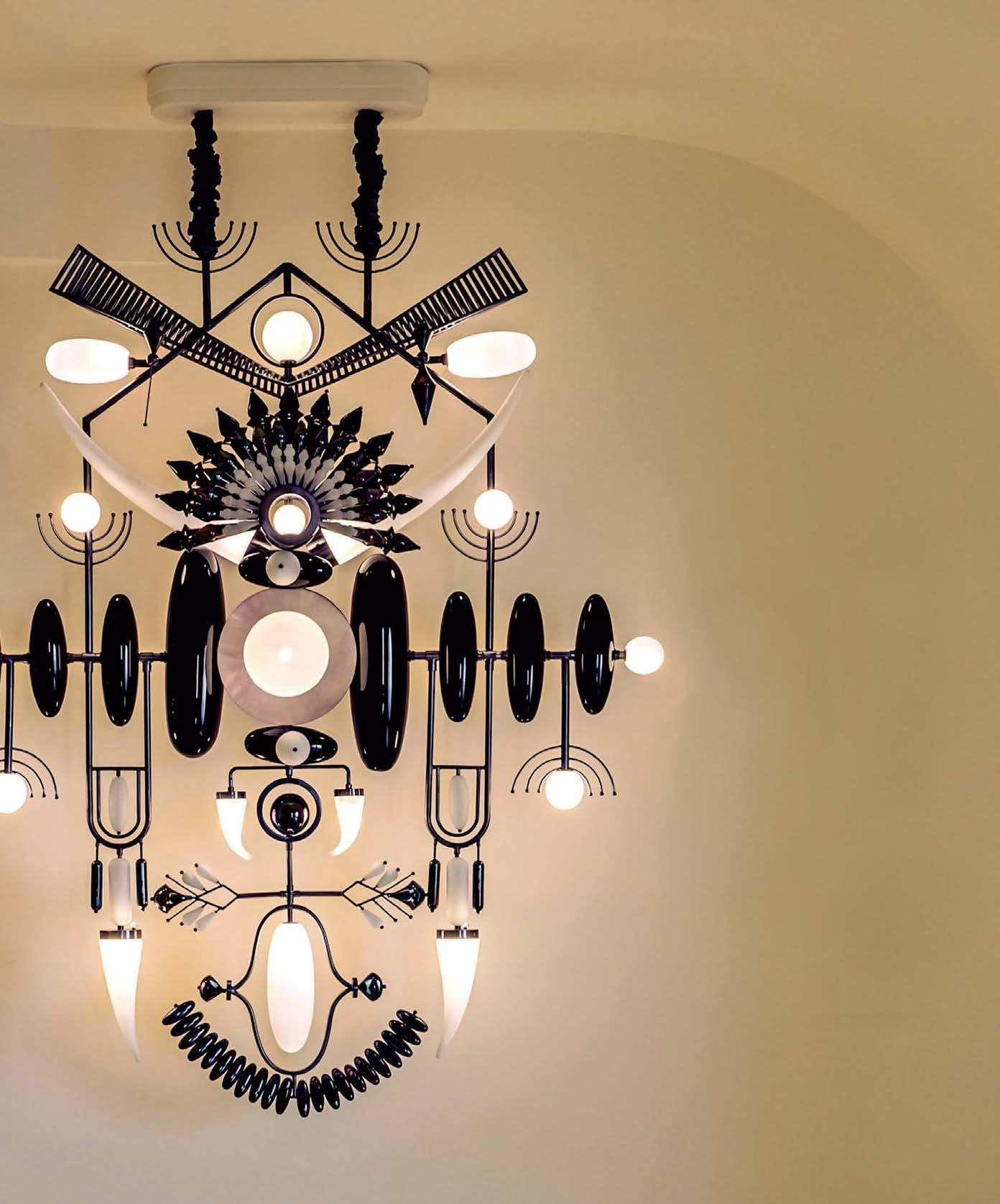 The living room’s bespoke sectional wears Loro Piana fabric, and the ottomans are by Disc Interiors. A Zia Priven chandelier and Porta Romana table lamp illuminate the space. From left, the artworks are by Rafael Soldi, Ann Hamilton and Jenny Riffle.