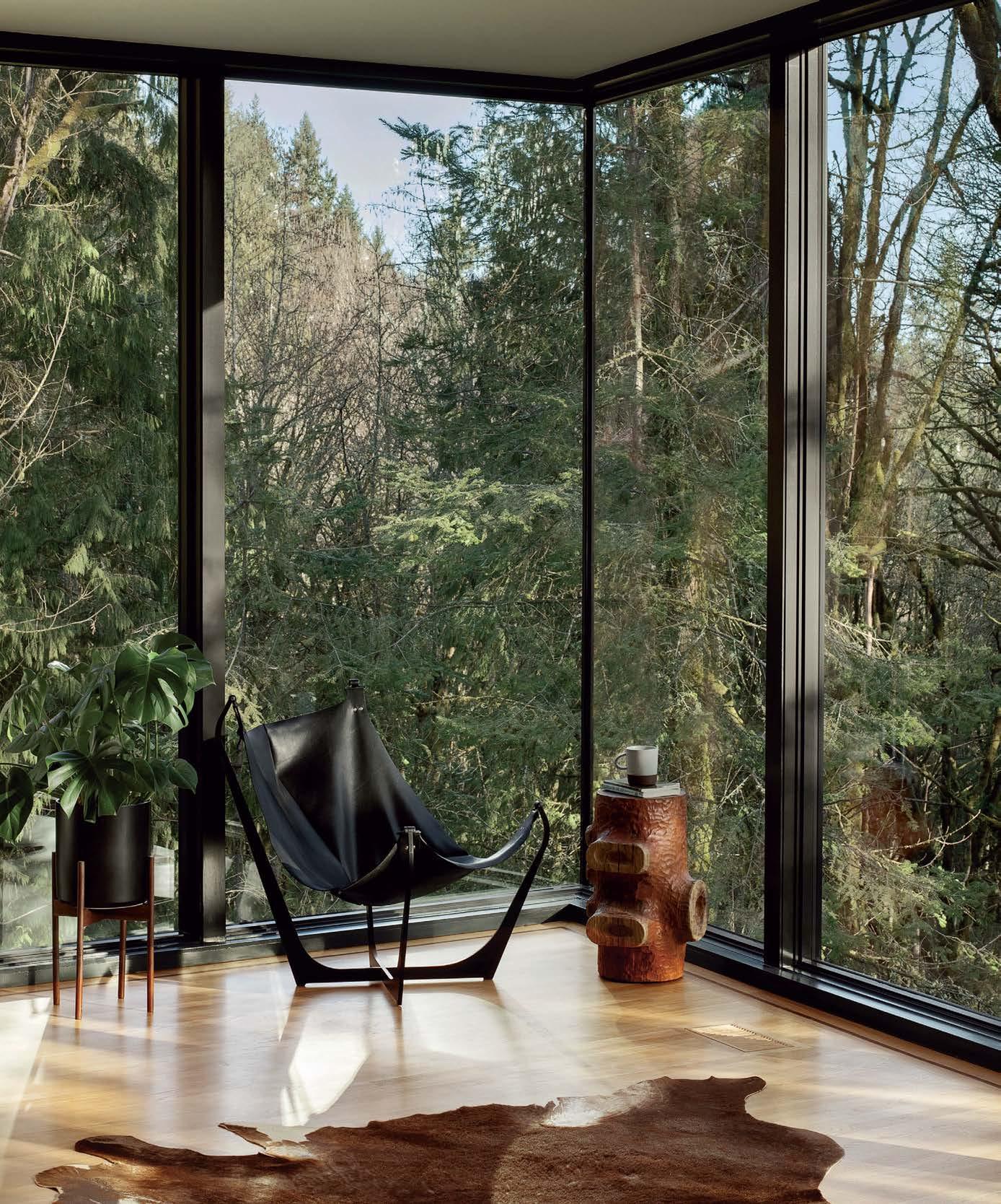 This Ketchum, Idaho, vacation home distills the romance of mountain living with its stunning views and rustic nature. The living room features Thayer Coggin’s Clip sofa and Crate & Barrel’s Tom coffee table.