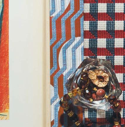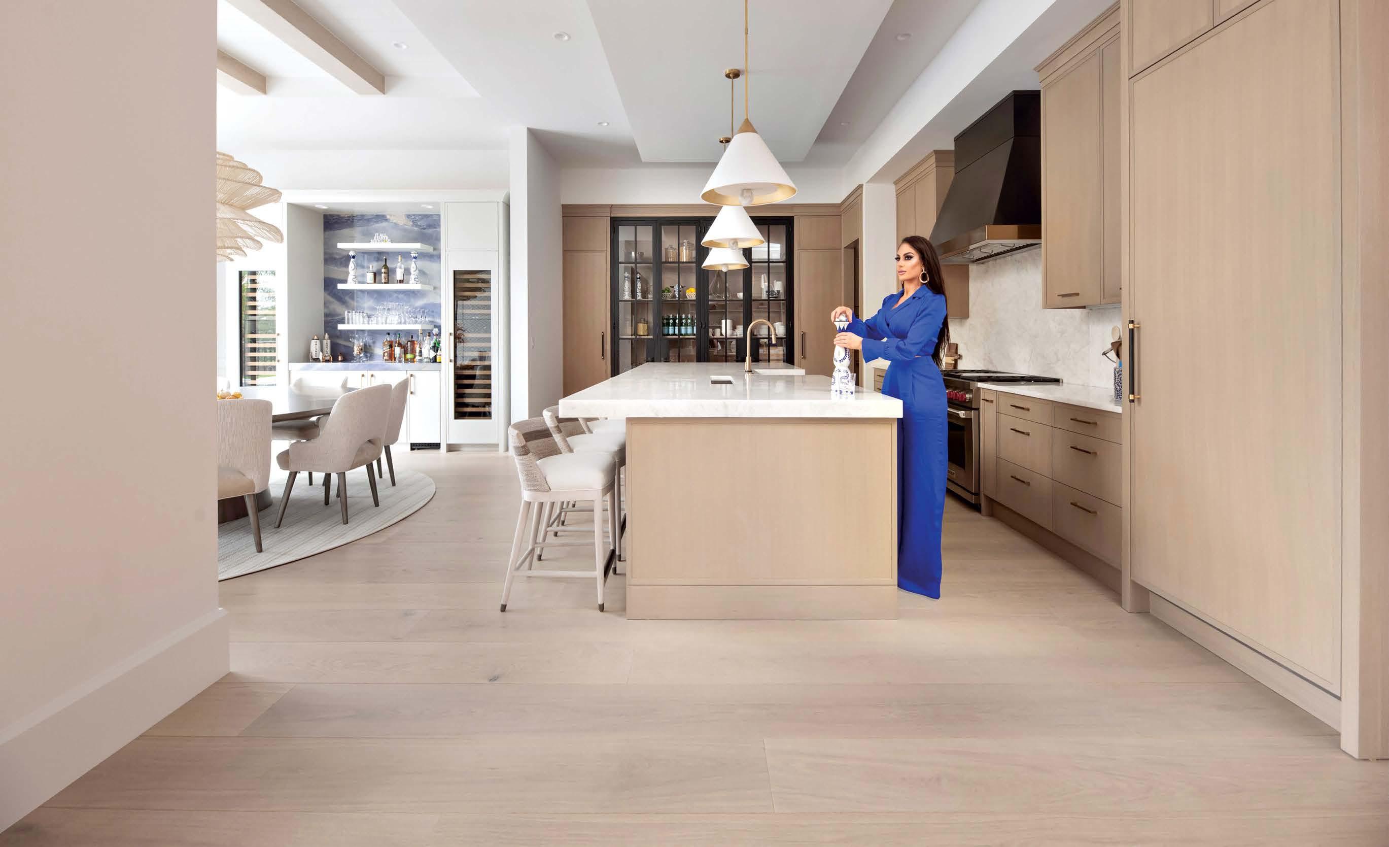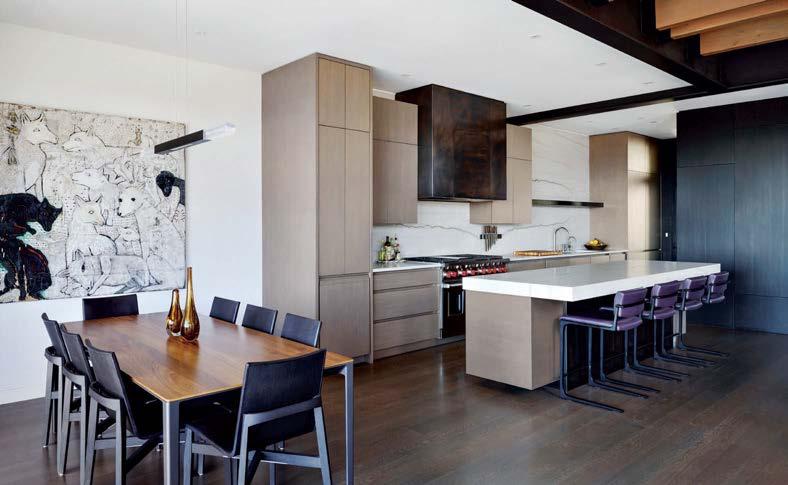 layout,” Elias notes. The space now greets guests with playful objets d’art and a prismatic triptych by Dale, an accomplished artist. Cocktails await at a new bar, bringing purpose to a previously empty niche. From there, festivities intuitively flow into the combined living and dining room. The team retained the dining space’s built-in banquette but reupholstered it with “an ikat print that plays well with the surrounding wood tones,” the designer says.