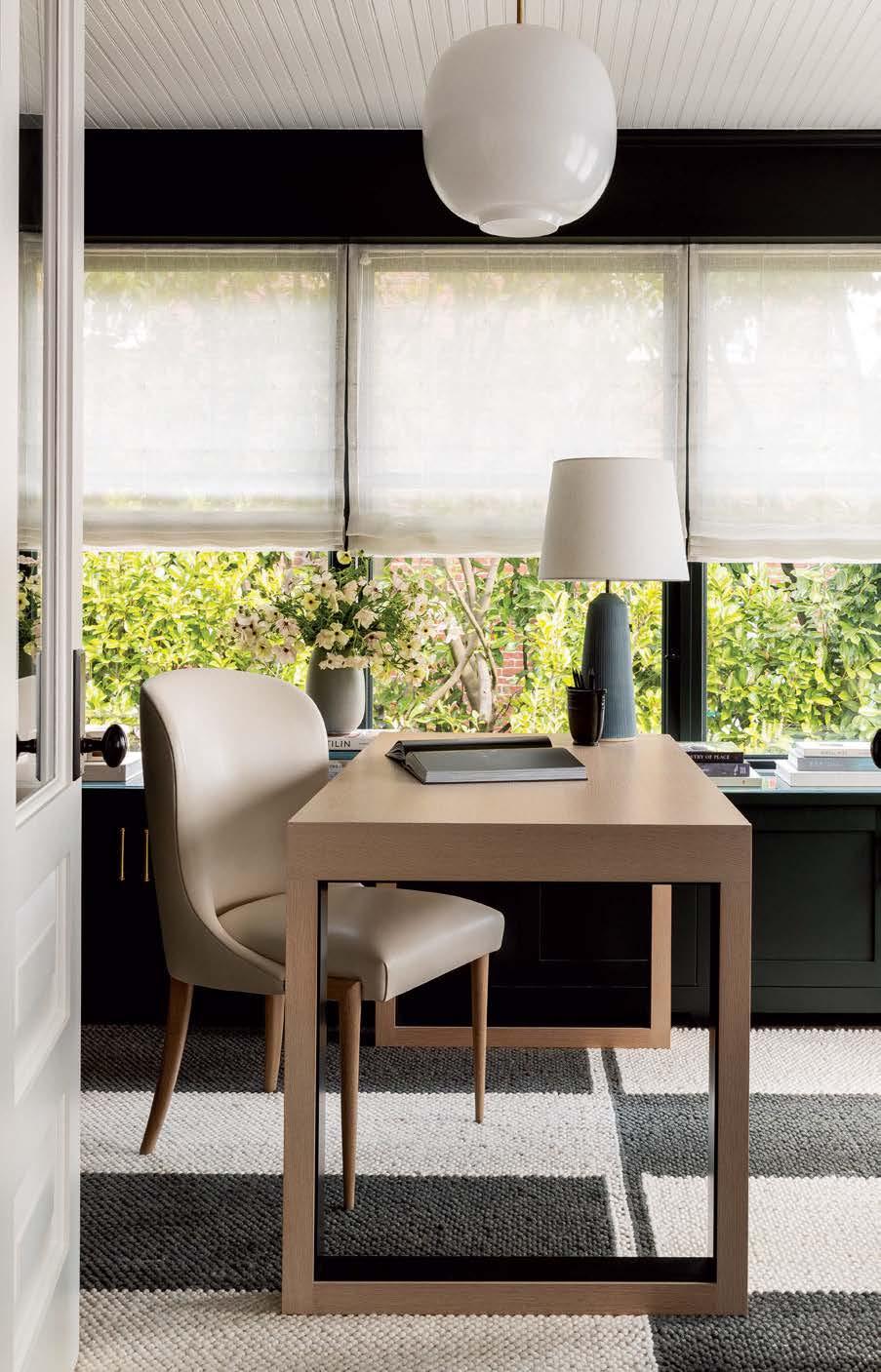 Right: Farrow & Ball’s Studio Green coats the wife’s office. The desk by Jonathan Pauls, Inc. joins a Quintus chair and Victoria Morris lamp. The Louis Poulsen pendant was found on 1stdibs. The floor covering is from Turabi Rug Gallery.