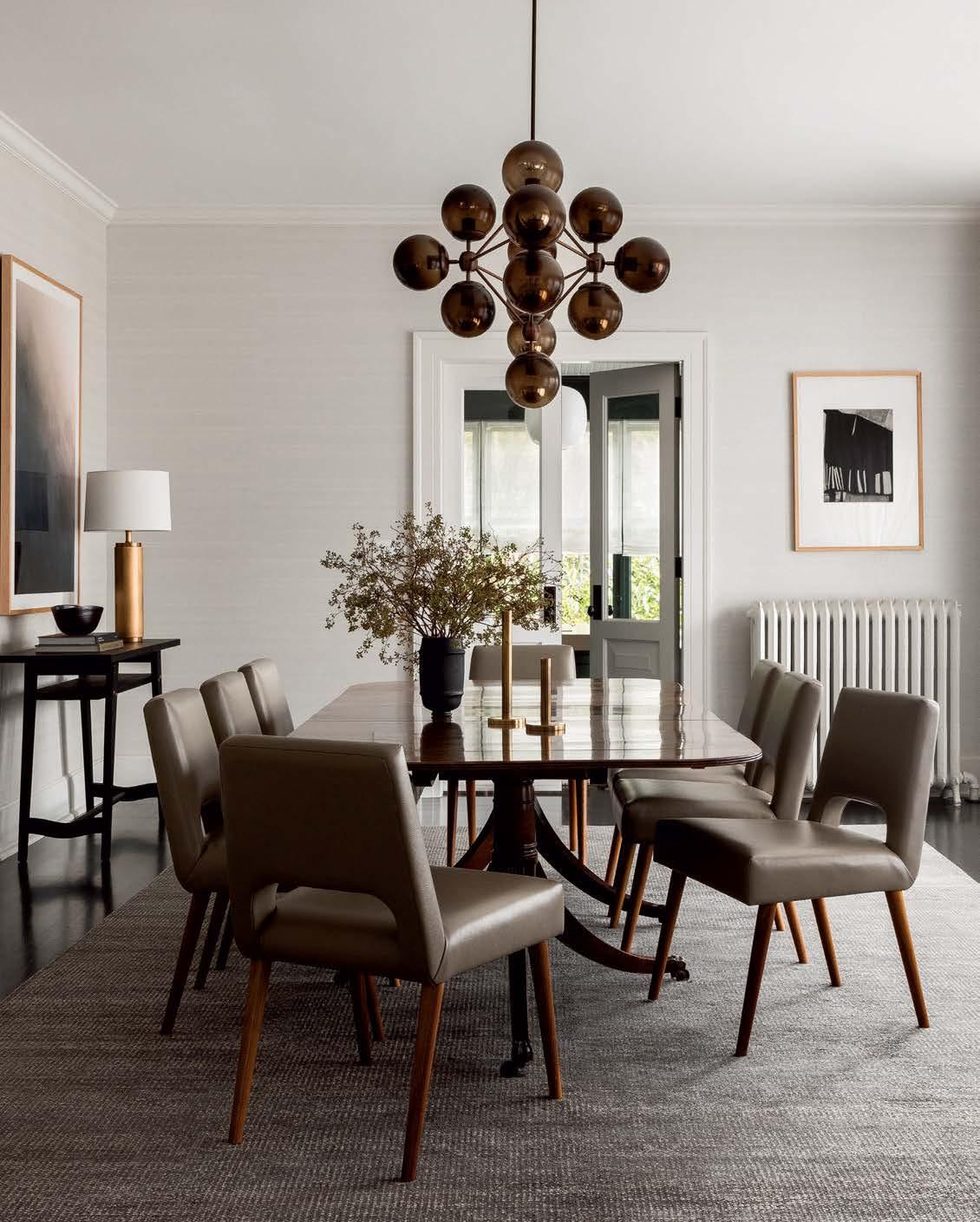 Opposite: The clients’ Harry Lunstead walnut-and-copper table, a family heirloom, takes pride of place in the dining room. It is paired with Costantini Pietro chairs and illuminated by a Hammerton Studio chandelier that designer Colleen Knowles likens to an art piece.