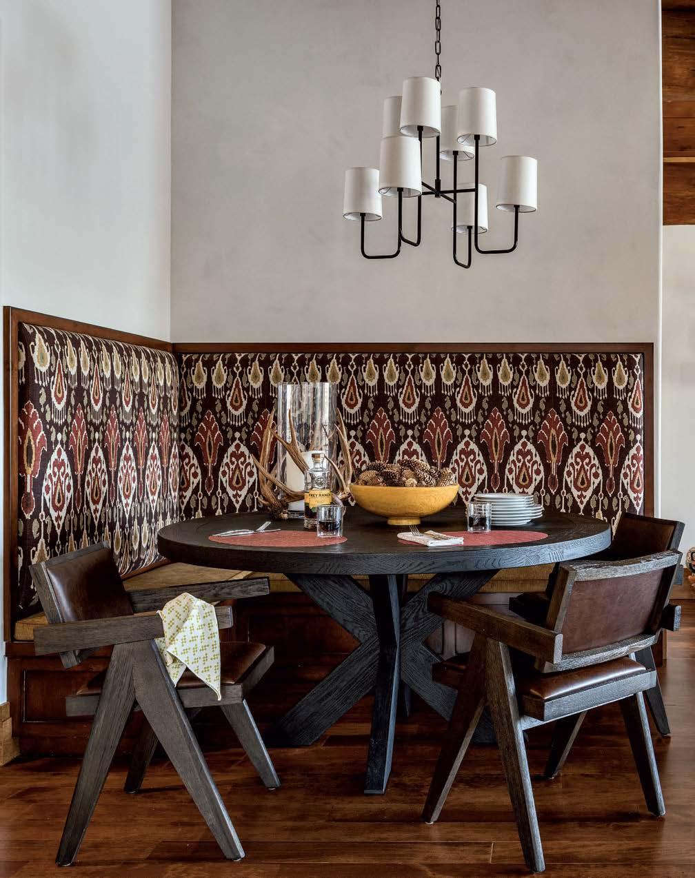 Opposite: A modern Lee Jofa ikat print revitalizes the dining room’s existing built-in banquette. Jakob leather armchairs and an X-base dining table, both from RH, adds functionality. The Visual Comfort & Co. Go Lightly chandelier hangs above.