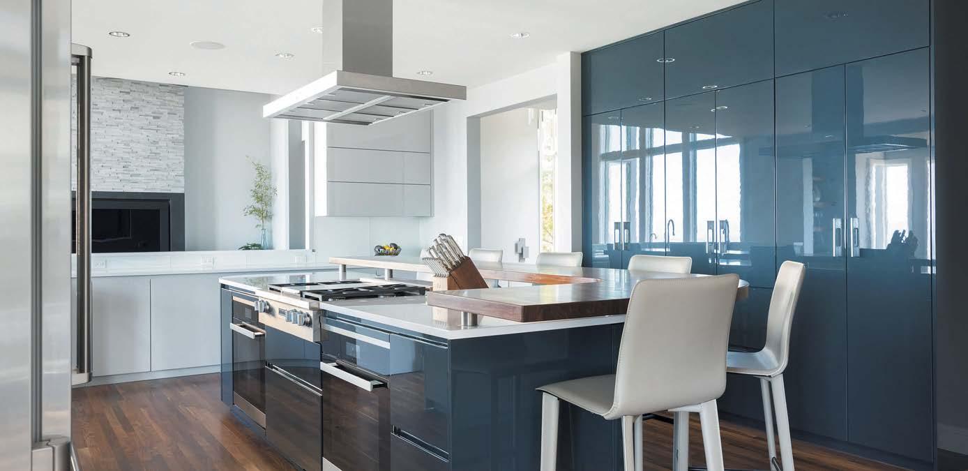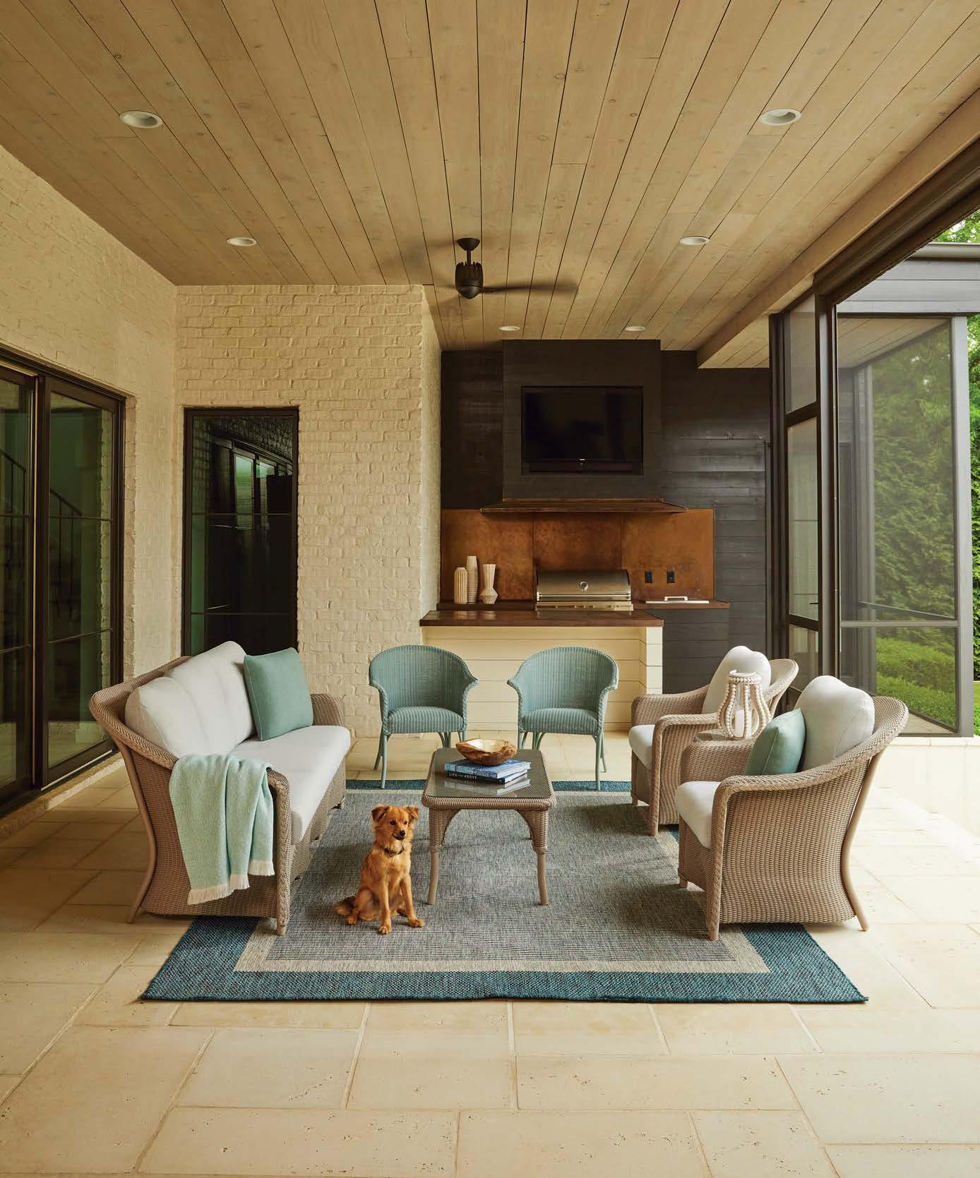 Indoors meets outdoors thanks to a sliding Weather Shield window and a countertop that extends from the kitchen to the exterior bar. The deck is made with Apollo Composite Decking and is furnished with Vondom stools, Brown Jordan armchairs and an Emissary side table.