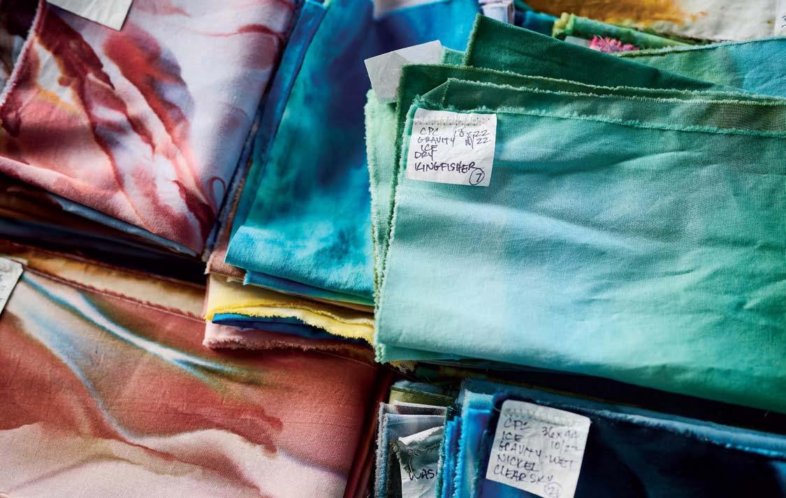 Lately, Cameron Anne Mason’s studio is an explosion of color, thanks to rows of drying racks filled with green, blue and turquoise fabrics. “These are ice-dye samples, where I use ice to slow down the color reaction,” explains the artist, who often sounds more like a scientist as she describes the practices she’s been refining for the last two decades. “I’m in the process of making 90 different swatches, because I need to know what all the colors look like with this technique. I’m a bit obsessive over this stuff, but these are my tools.”
