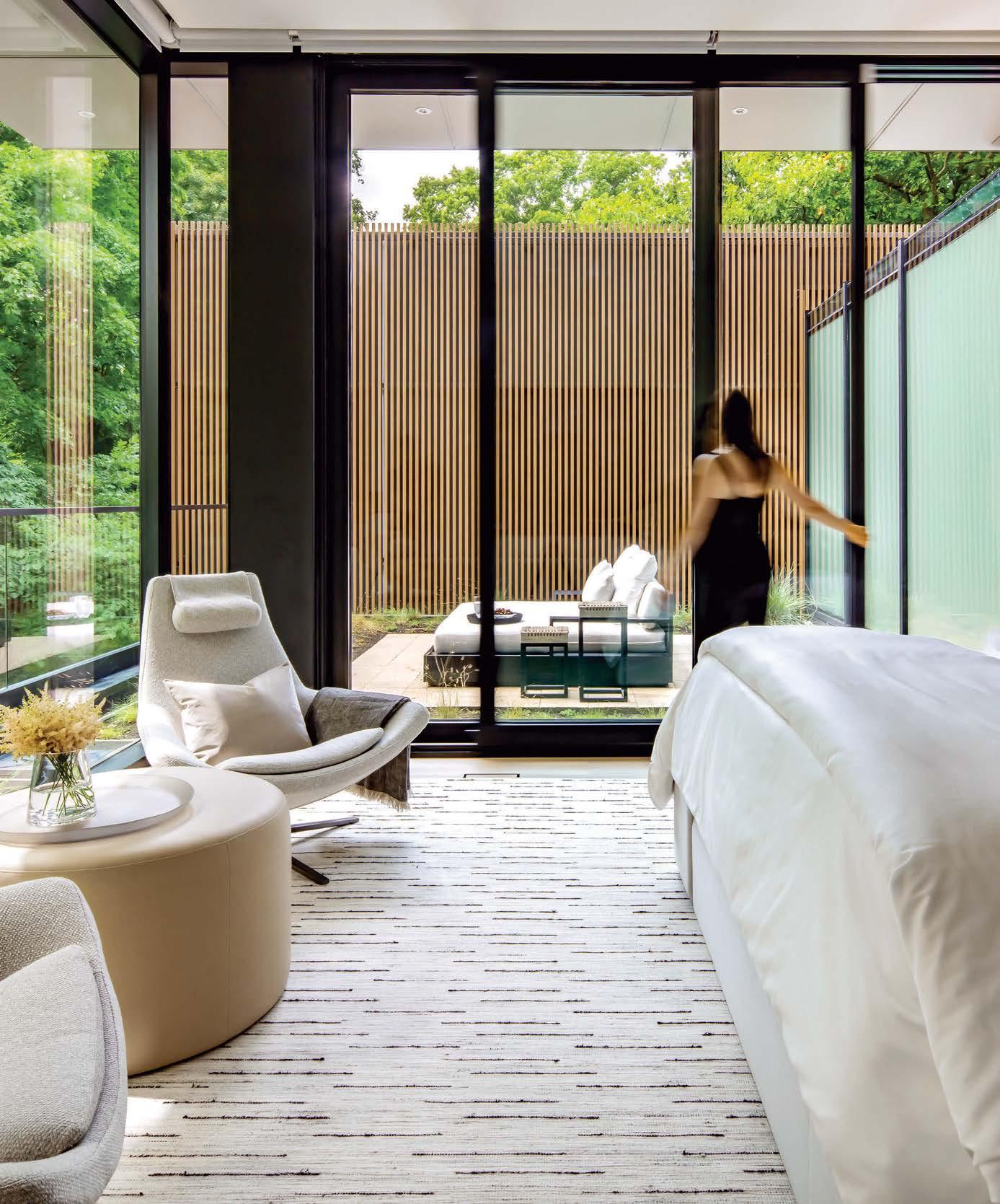 Above: A matching Fritz Hansen Fri chair and ottoman by Jaime Hayon creates a cozy corner in the primary bedroom. Custom drapes made with Casamance Kongo fabric and wall-to-wall wool carpet by Nourison envelop the space in lush comfort.