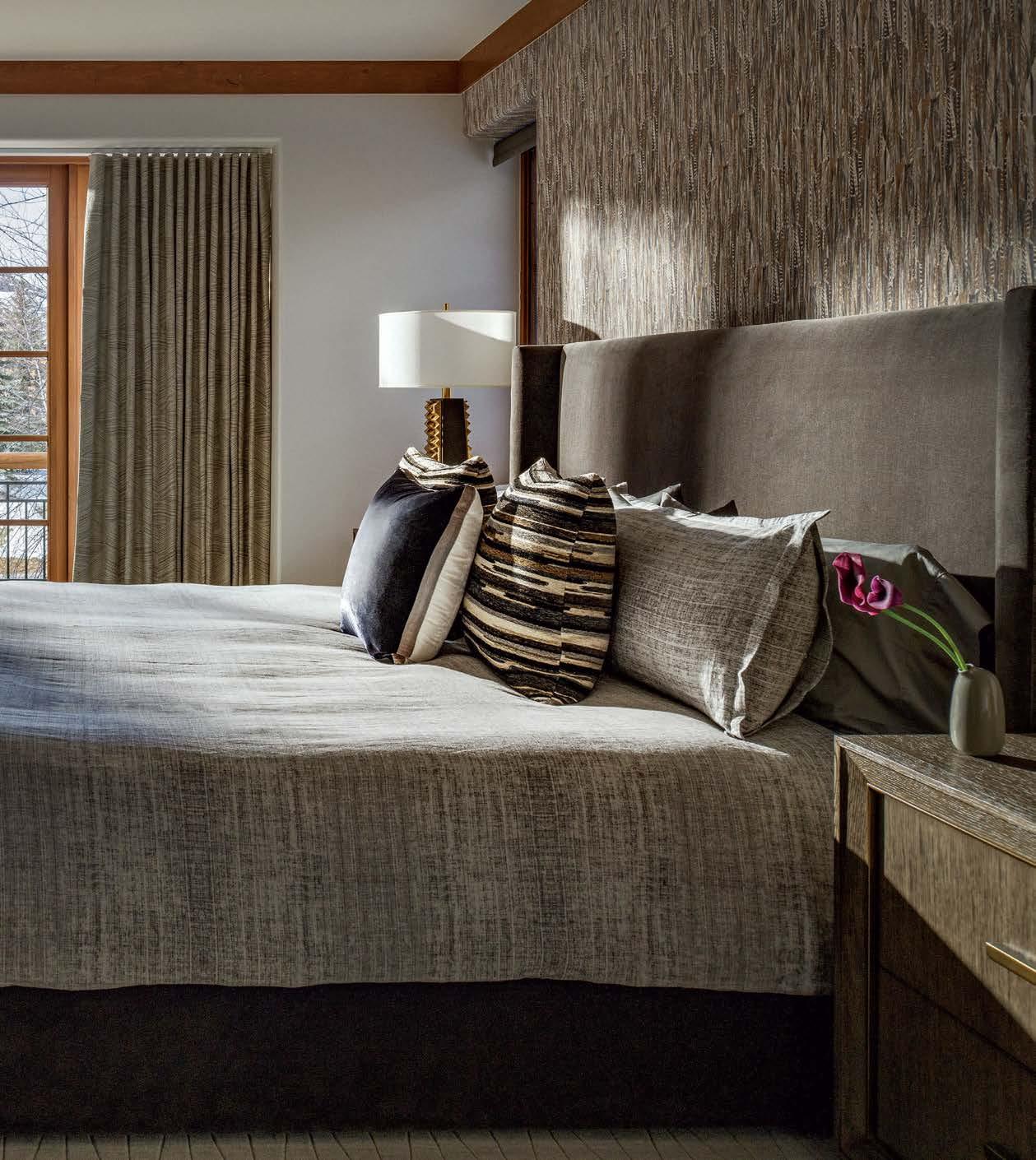 Right: The primary bedroom feels layered in textured depth, featuring Casamance’s Lahna wallcovering, an RH upholstered Lawson bed and custom-made velvet pillows from Tribes Interiors. A custom lacquered console handily conceals a television.