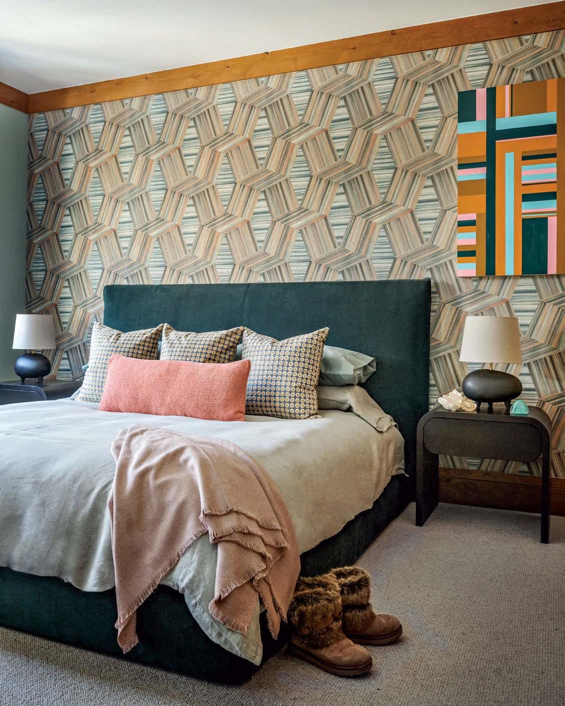 The color palette remains subdued and naturalistic in the main social areas, harmonizing with the rugged woods. But motifs became daring in the private areas that, prior to the remodel, lacked the same architectural detailing. “A lot of the art Dale makes has really bold color stories, so it was nice to add in those elements,” Turkus explains. Different prints and textures give each bedroom suite a distinct character—from the geometric wallcovering of the retro-glam guest space (where Weiss loves to stay), to the storybook forest wallpaper in the grandchildren’s bunk room. “It’s fun when you get to reside in a bedroom that has such a personality,” Weiss adds.