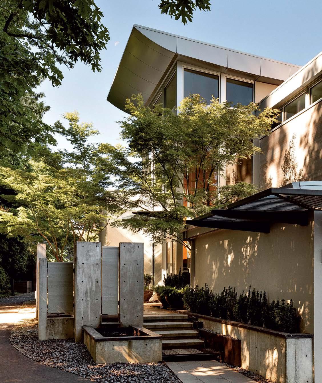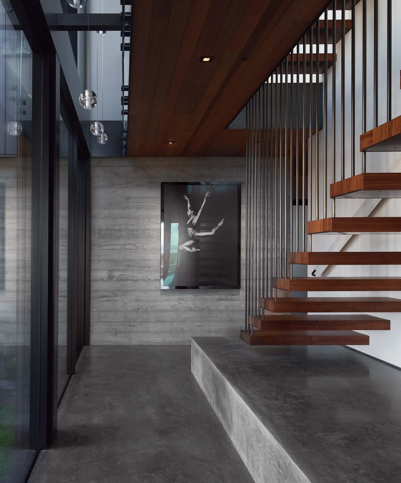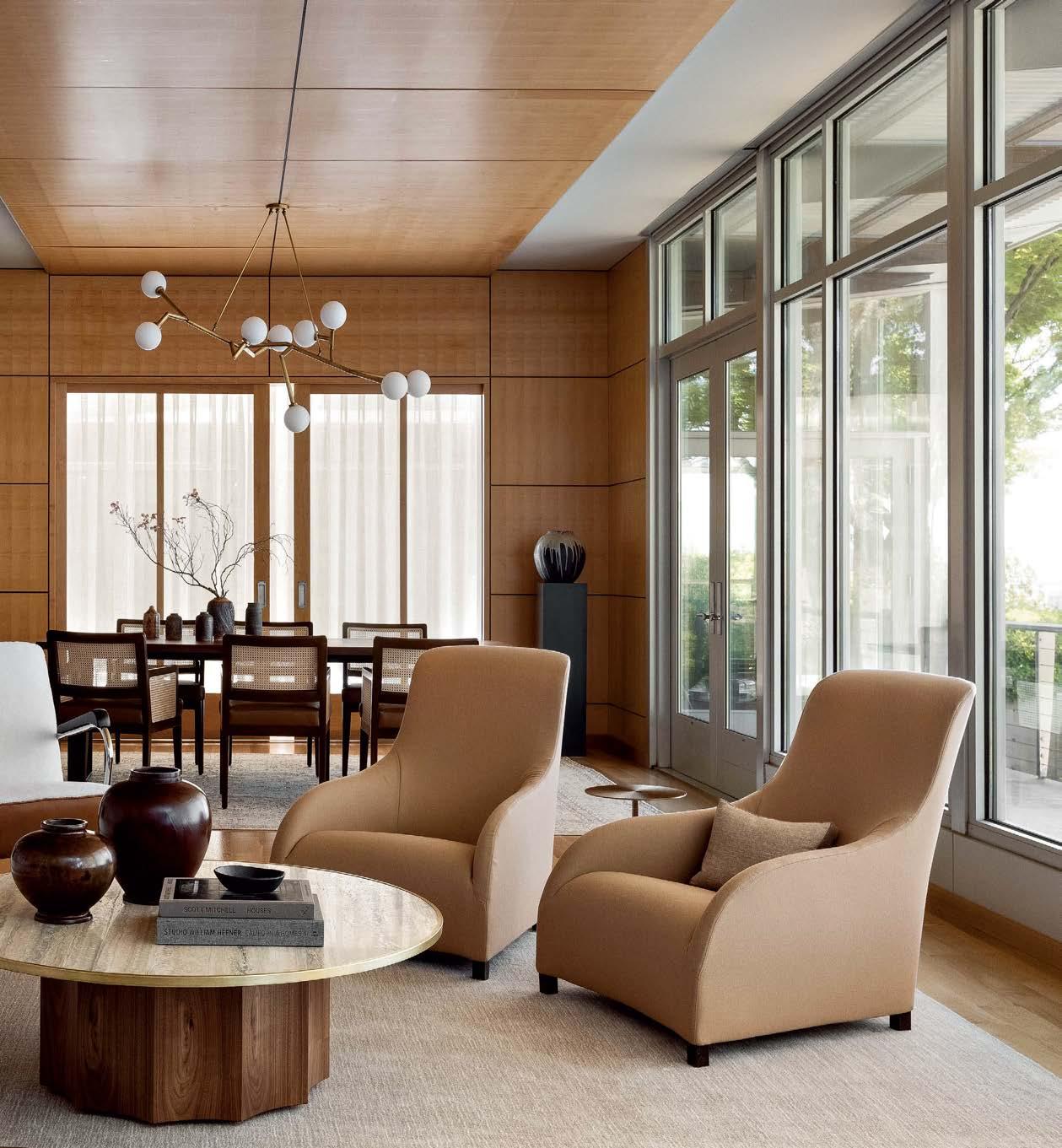 This influence is clear in the exterior’s tiered rectilinear shapes, with portions chiseled away to form a sweeping outdoor terrace protected by the cantilevered floor above, as well as a private balcony servicing the couple’s suite. Floor-toceiling windows and sliding glass doors perforate the walls, drawing vistas inside. Landscape designers Boo Y. Jang and Jerry Coburn then surrounded the structure with sculptural greenery like feather reed grass and foxtail lilies, which “seamlessly harmonize with the architectural geometry of the home,” Jang notes.