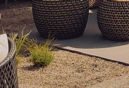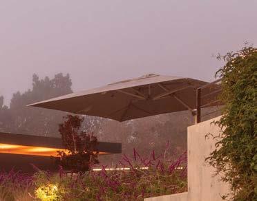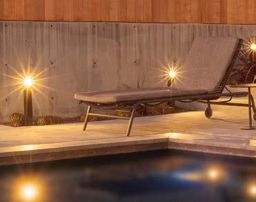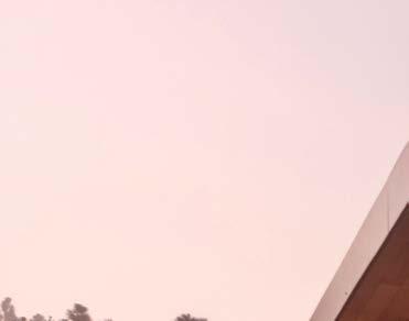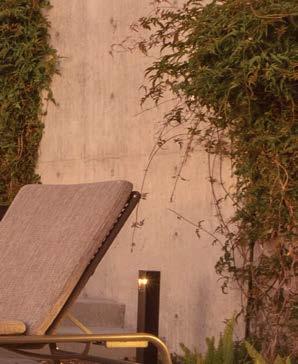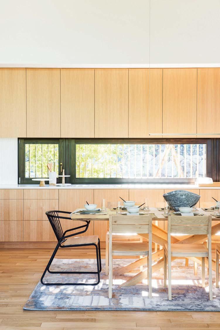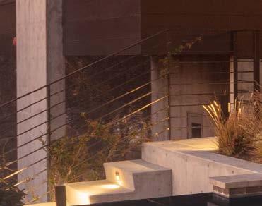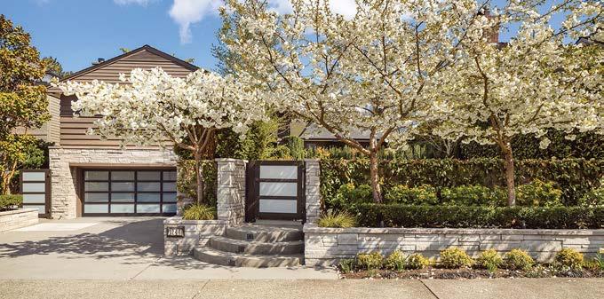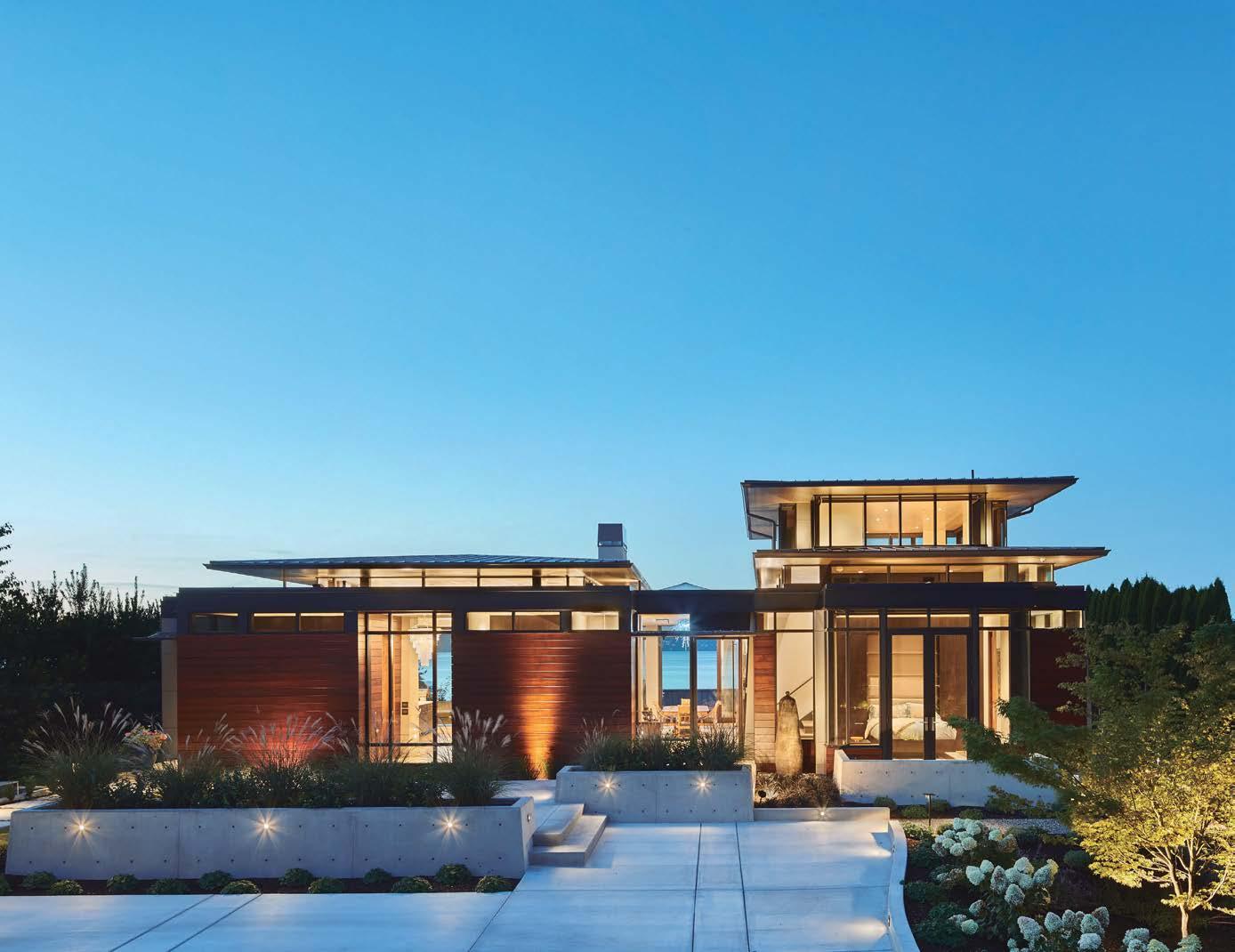 This influence is clear in the exterior’s tiered rectilinear shapes, with portions chiseled away to form a sweeping outdoor terrace protected by the cantilevered floor above, as well as a private balcony servicing the couple’s suite. Floor-toceiling windows and sliding glass doors perforate the walls, drawing vistas inside. Landscape designers Boo Y. Jang and Jerry Coburn then surrounded the structure with sculptural greenery like feather reed grass and foxtail lilies, which “seamlessly harmonize with the architectural geometry of the home,” Jang notes.