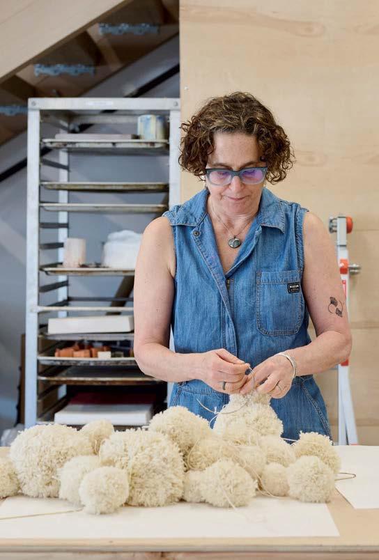 A large sculpture, Ancestor 1, towers in Nancy Mintz’s art studio (opposite). There, she works with wool pompoms for a project she’s considering (left). Her fan-like artworks, called Ganodermas (below), are named for the type of mushroom from which they draw their shape. Syncopation (bottom), an installation made of several small pieces, will be on view at the Bainbridge Island Museum of Art.