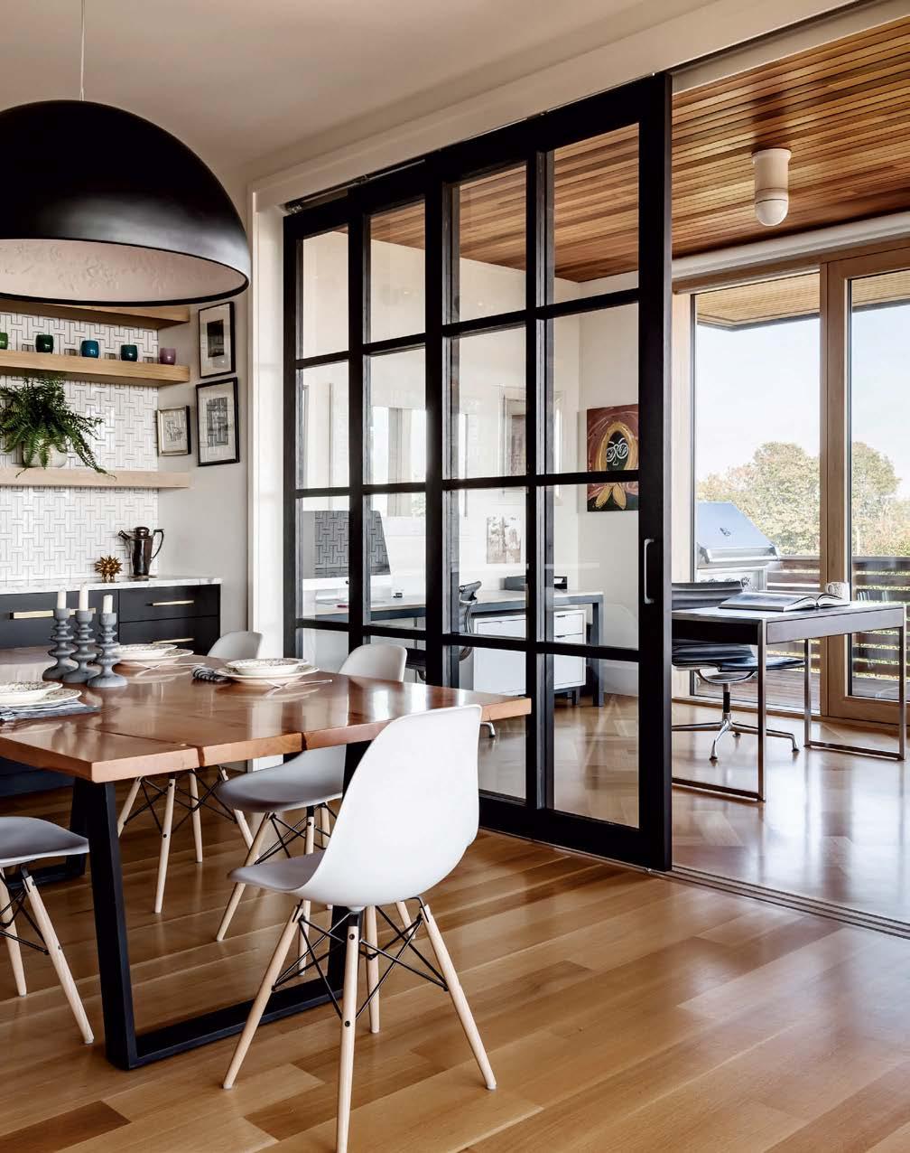 Above: Instead of isolating their offices, the couple wanted to centrally situate their work space as part of the main living area. Glass doors by Unilux Windows from Washington Window & Door expose the Room & Board desk to the light and views.