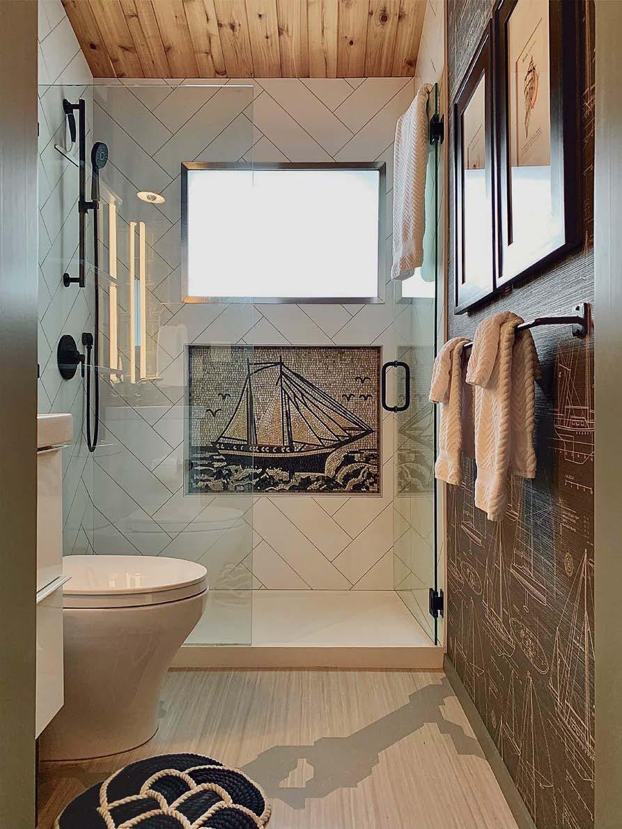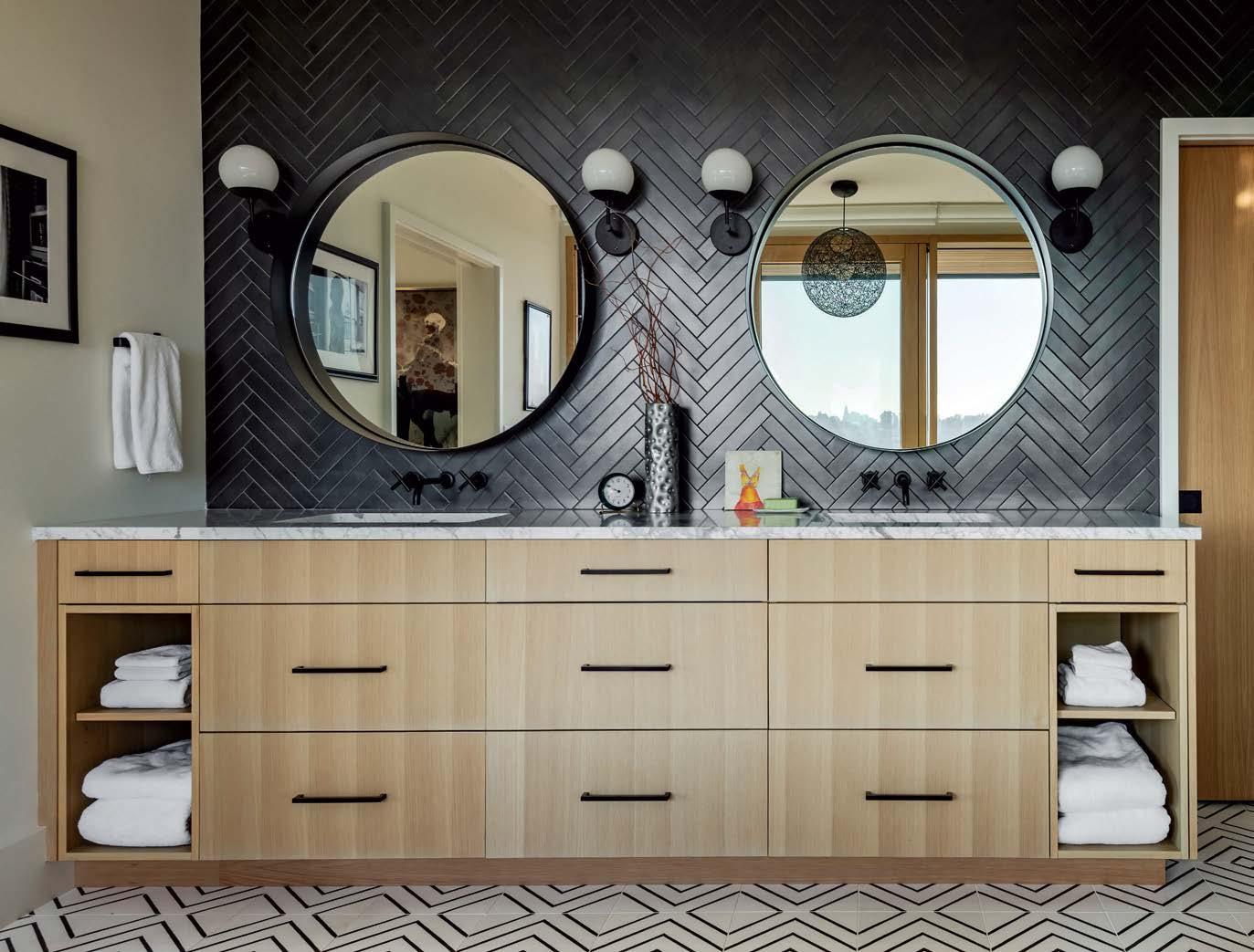 Above: The primary bathroom is a study in black and white, with Ann Sacks tile on the walls and floors, and a Statuario Bianco marble countertop on the white oak vanity by Winterwood Cabinetry. Schoolhouse sconces bring industrial metal accents.