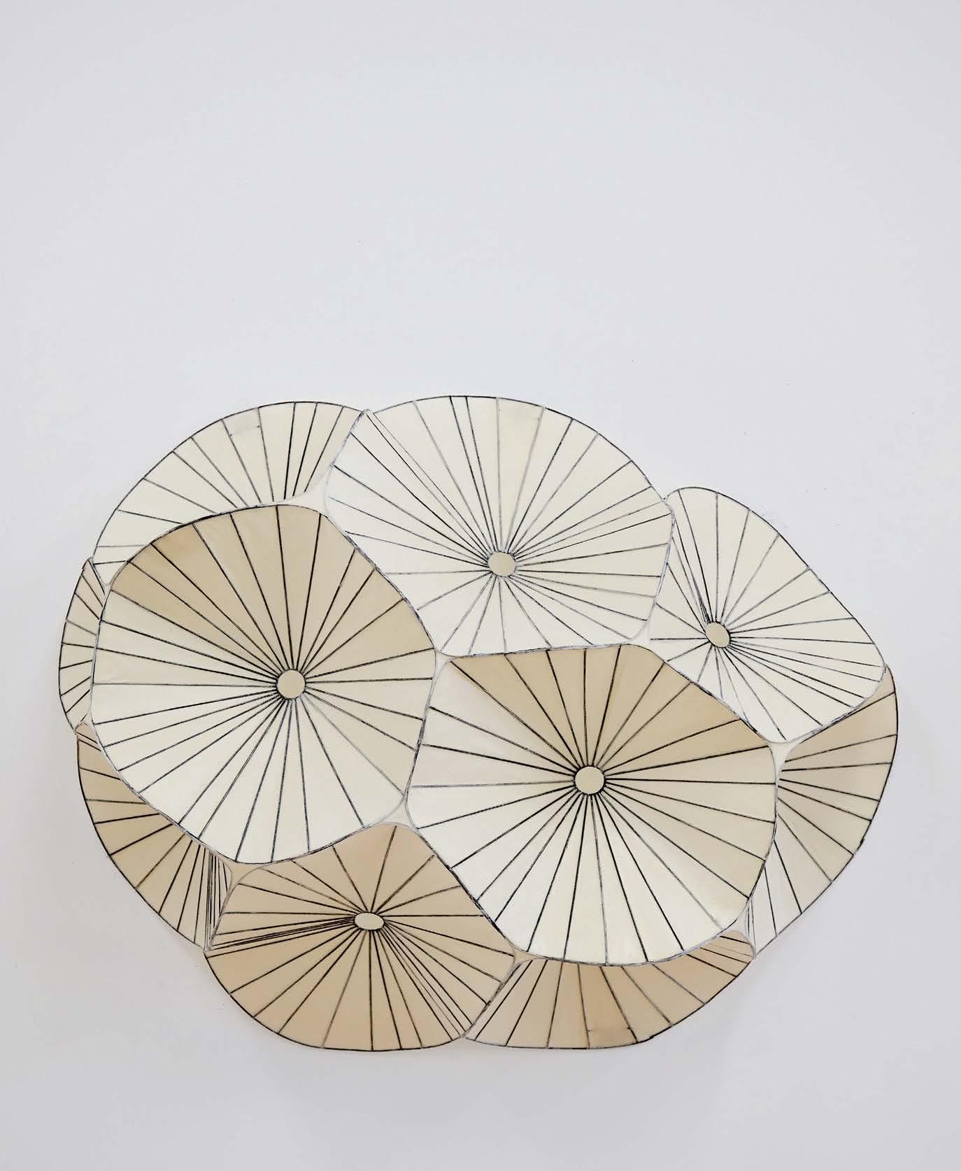 Mintz’s biomorphic and geometric forms pulse and undulate, her pieces often arranged in site-specific installations that cascade down walls, drip from ceilings and sprout from floors. “I wish for my work not just to be a piece on the wall but to be in conversation with the architecture around it,” Mintz says as she gestures toward Syncopation, a large piece set to be exhibited at the Bainbridge Island Museum of Art this year.