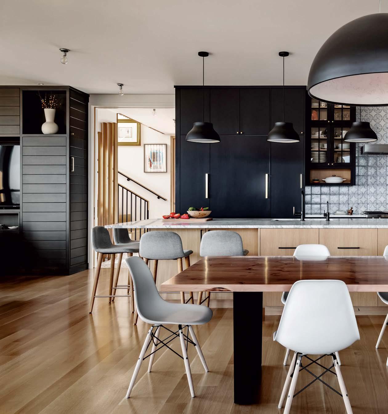 Adjacent to the dining area is the kitchen, where a white oak island with a marble countertop from Meta Marble & Granite contrasts against black-stained cabinets—both custom built by Winterwood Cabinetry. The hand-painted Ann Sacks terra-cotta tile backsplash adds a rustic note to the otherwise industrial aesthetic.