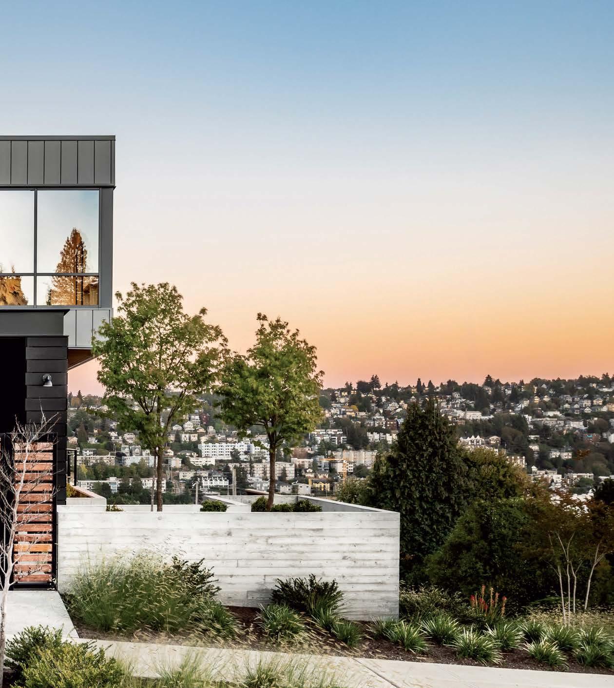 The façade features different finishes accentuating each box segment: board-formed concrete for the ground basement level, inkyblack Richlite (a locally manufactured resinand-paper product) on the main floor, and gray zinc for the second story. Inspired by shipping pallets, the slatted ipe wood terrace railings and perimeter fence integrate organic warmth. “We wanted to try new things,” says Heather of the