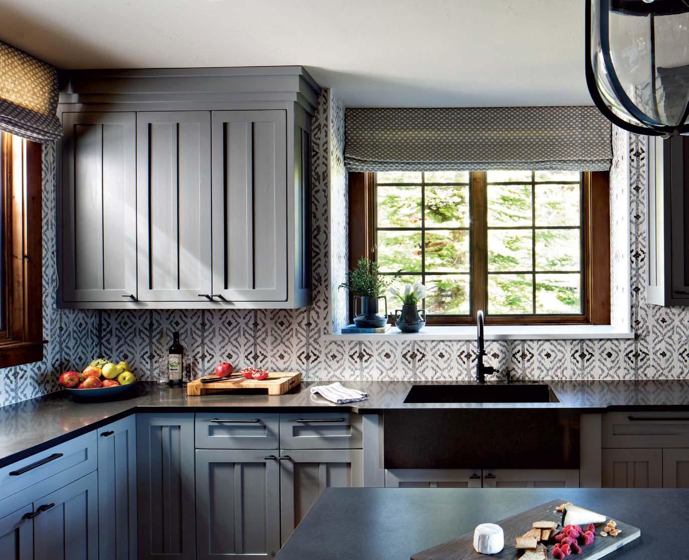 Above: Bespoke cabinetry by Northwest Custom Cabinets painted in Benjamin Moore’s Vintage Pewter contrasts against the kitchen’s warm oak floors. For the backsplash, Encore Ceramics’ field tile is set in a traditional running bond pattern.