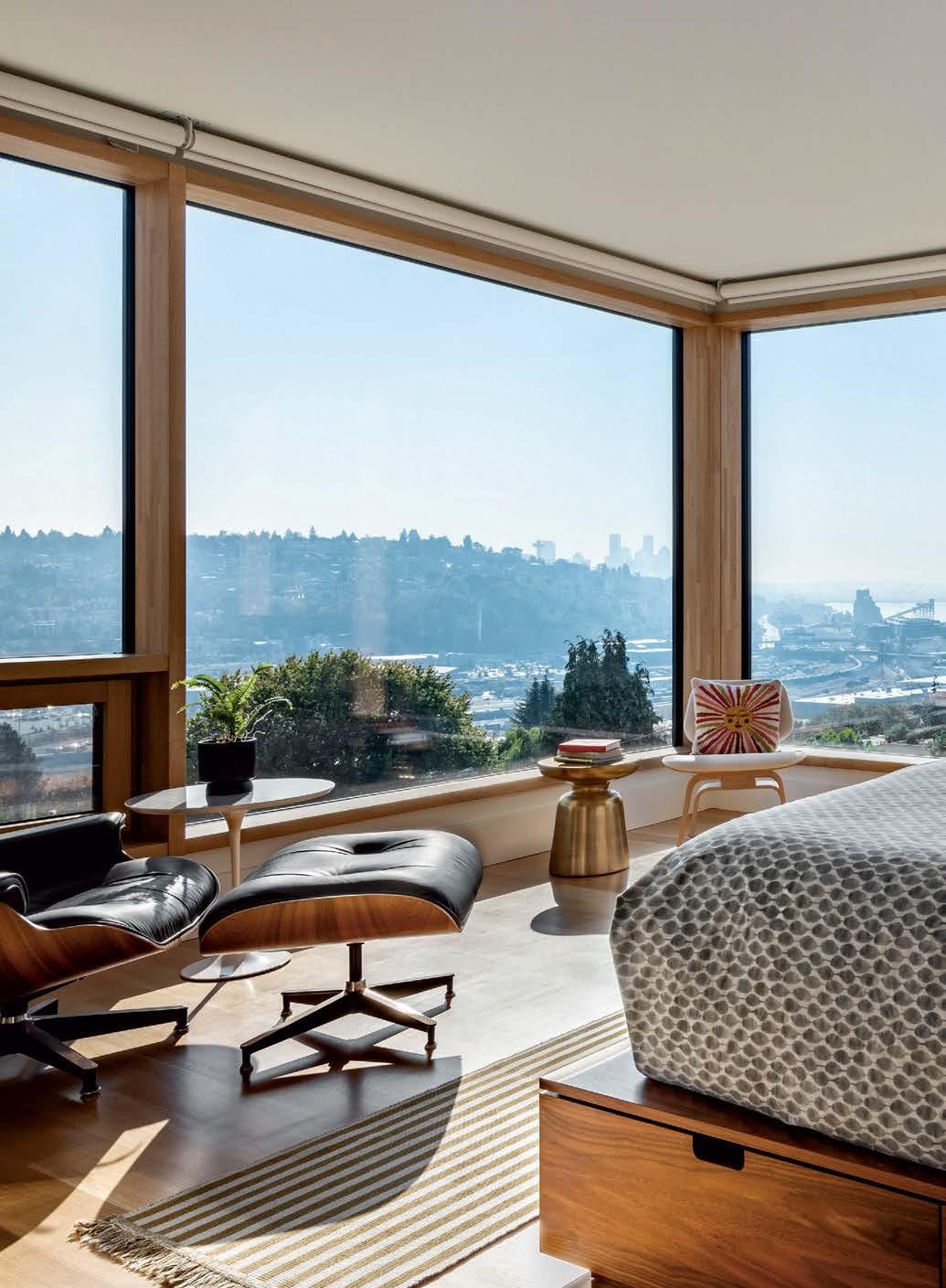 In the primary bedroom, an Eames lounge chair and a bed designed by the couple are perfect vantage points for the vistas. A Kate Roebuck artwork and Hygge & West wallpaper imbue the serene space with color.