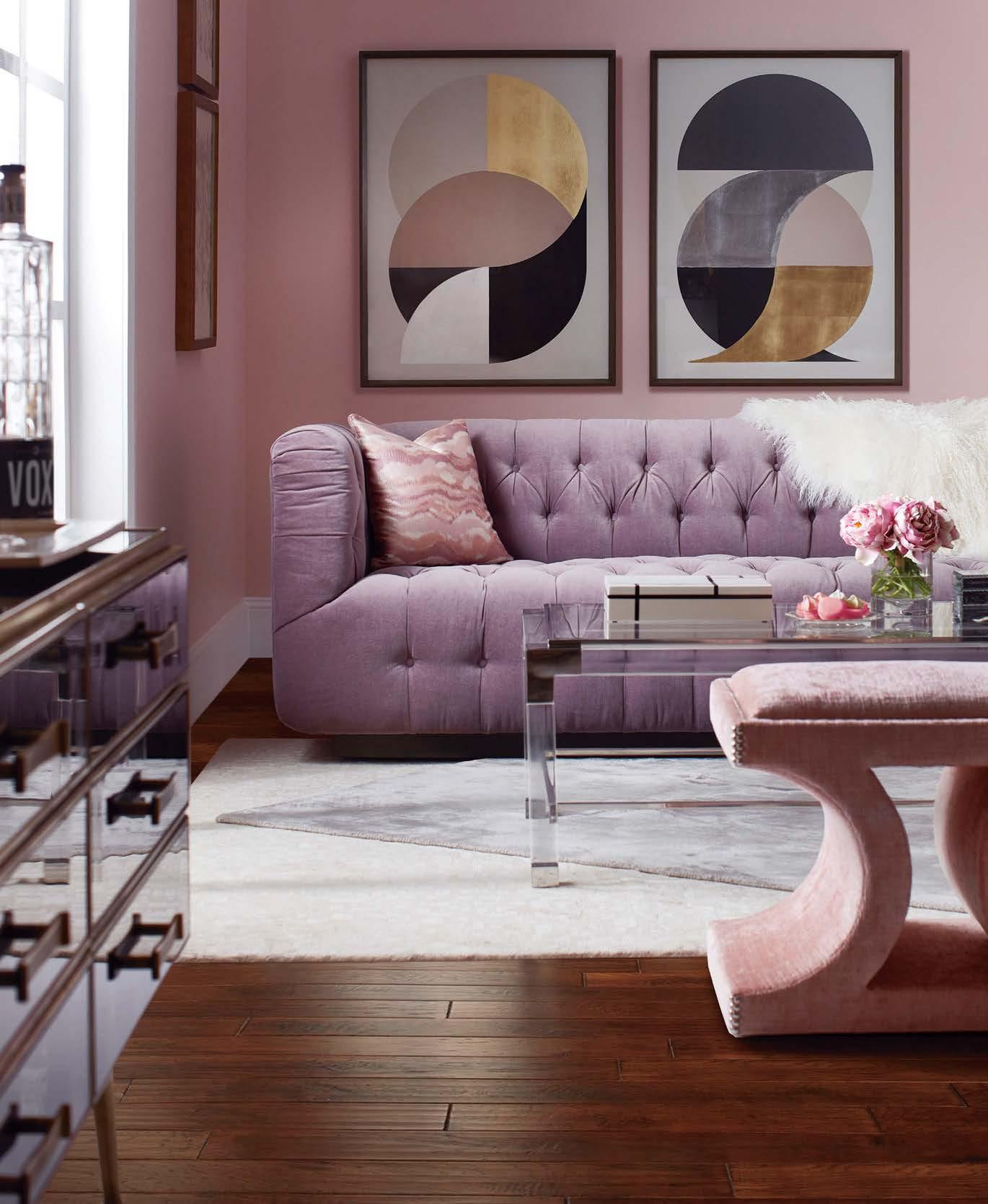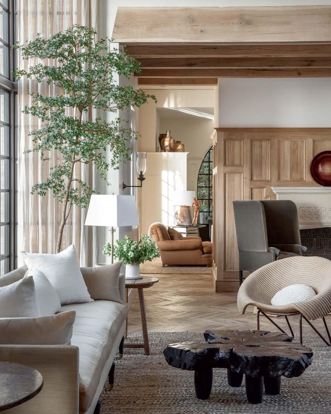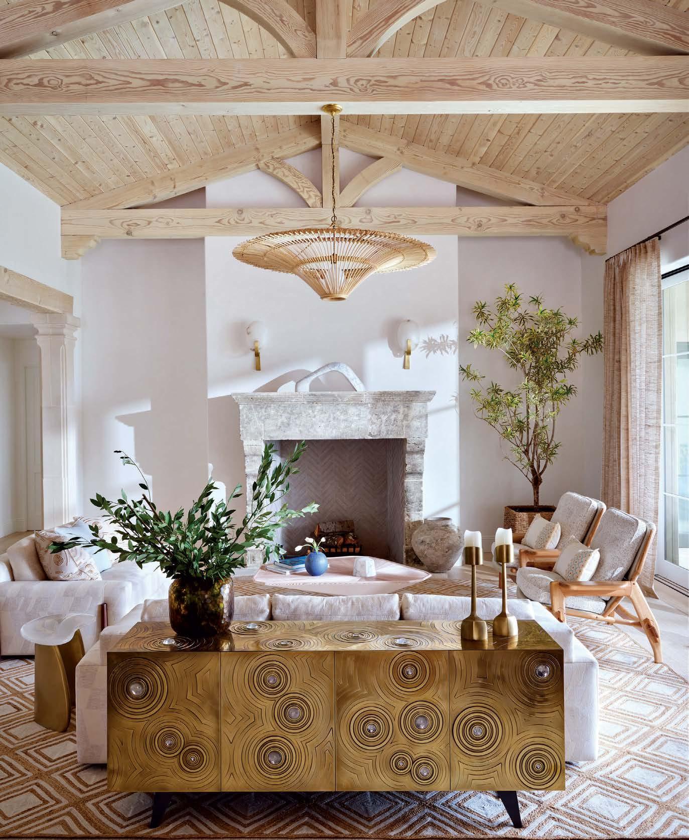 of an arched mirror and Four Hands coffee table atop a hand-tufted Jaipur Living rug. Page 210